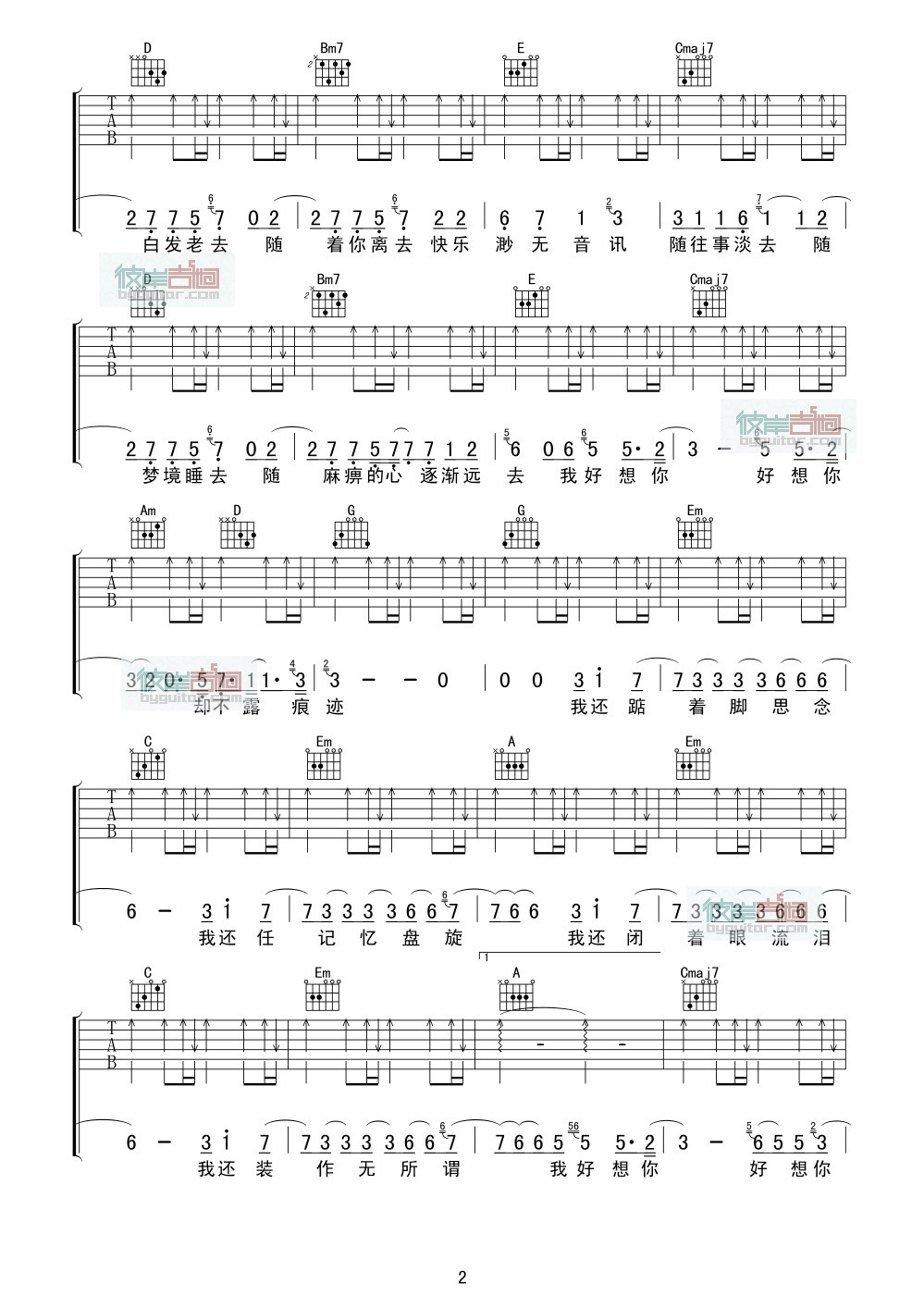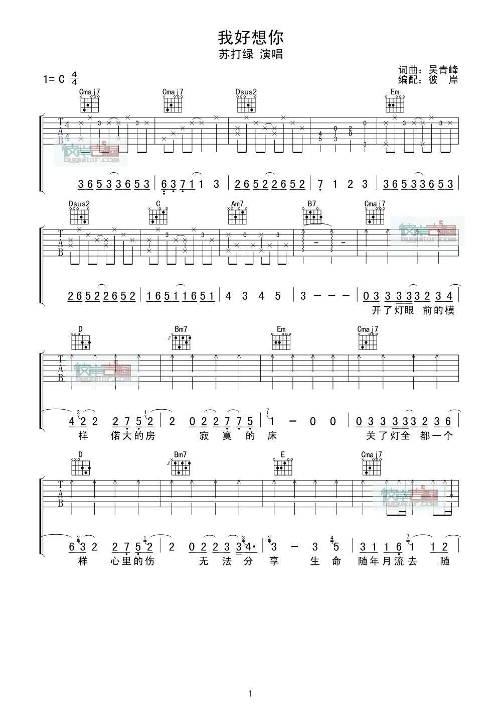 曲谱介绍: 苏打绿《我好想你》吉他弹唱谱,采用C调指法编配,彼岸吉他编配出品,共有3张高清图谱。