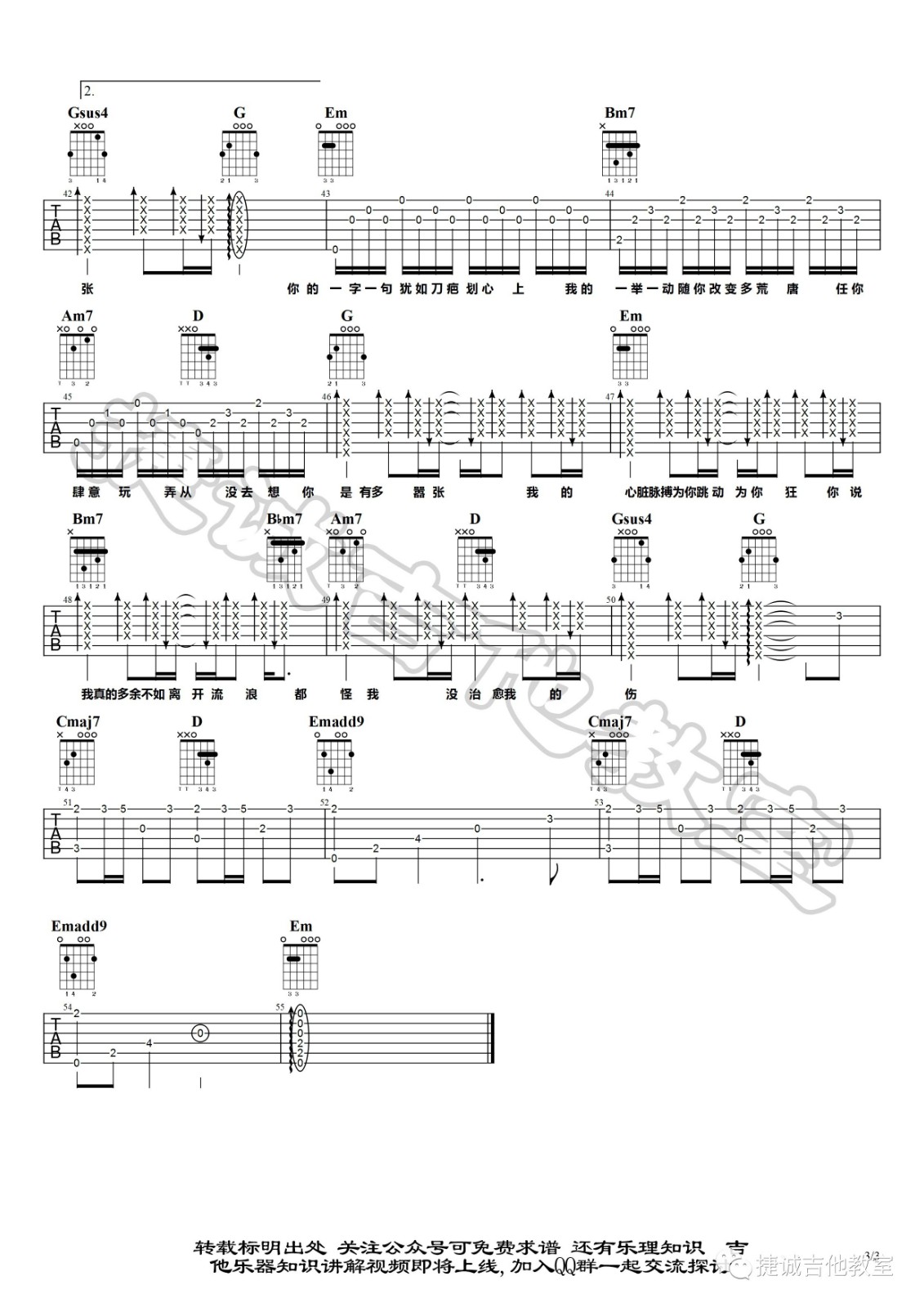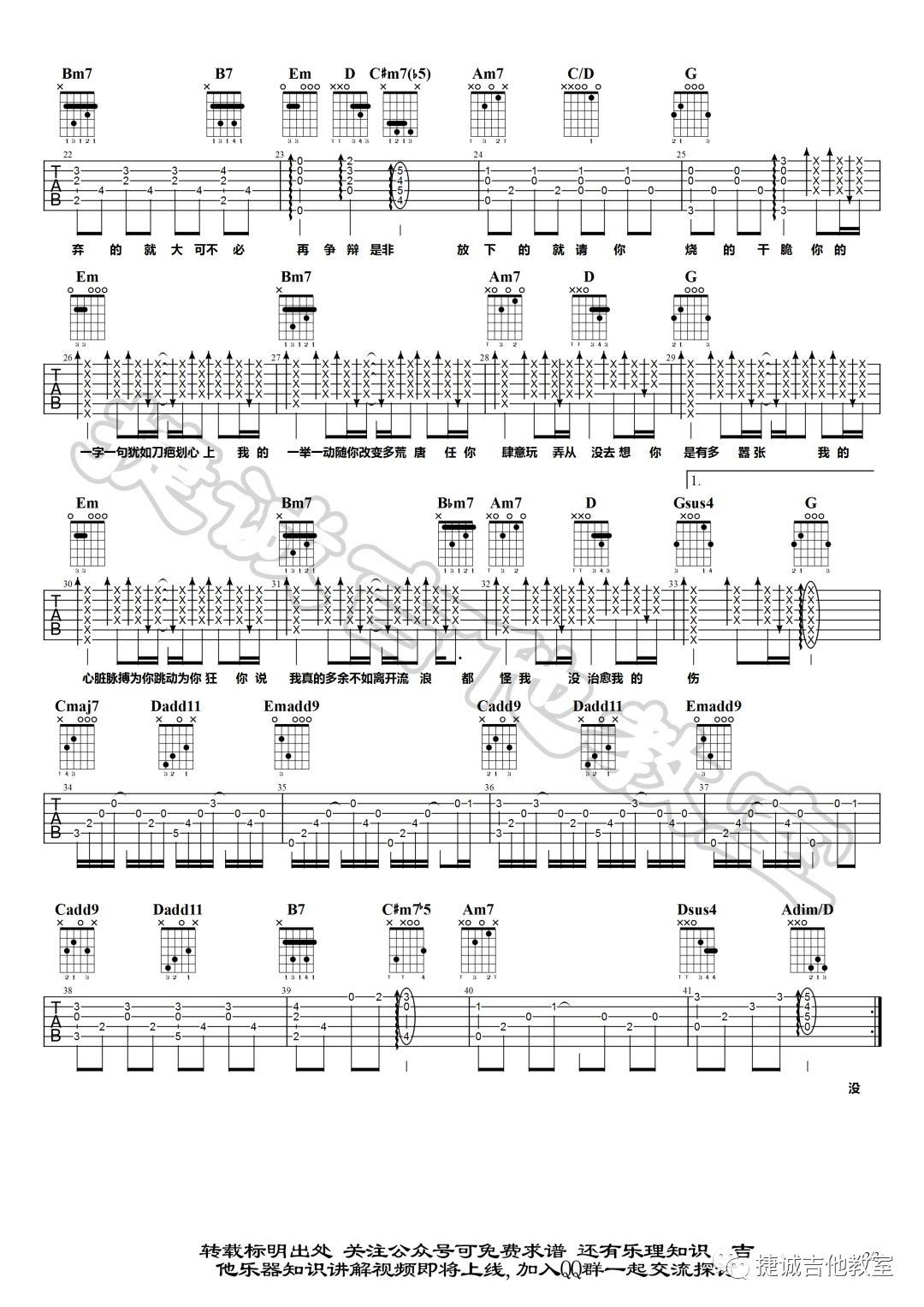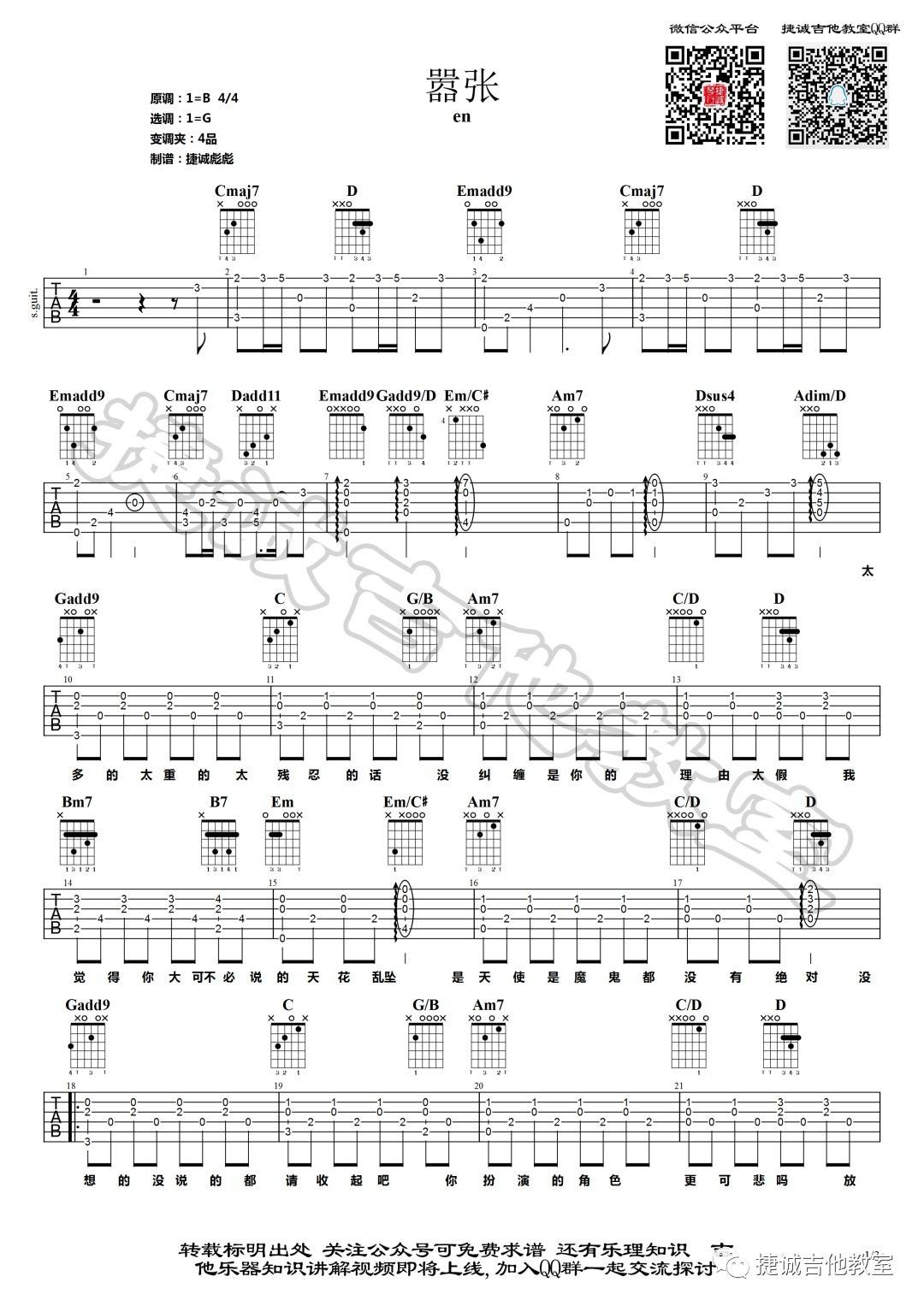 曲谱介绍: En《嚣张》吉他弹唱谱,采用G调指法编配,捷诚吉他教室编配出品,共有3张高清图谱。