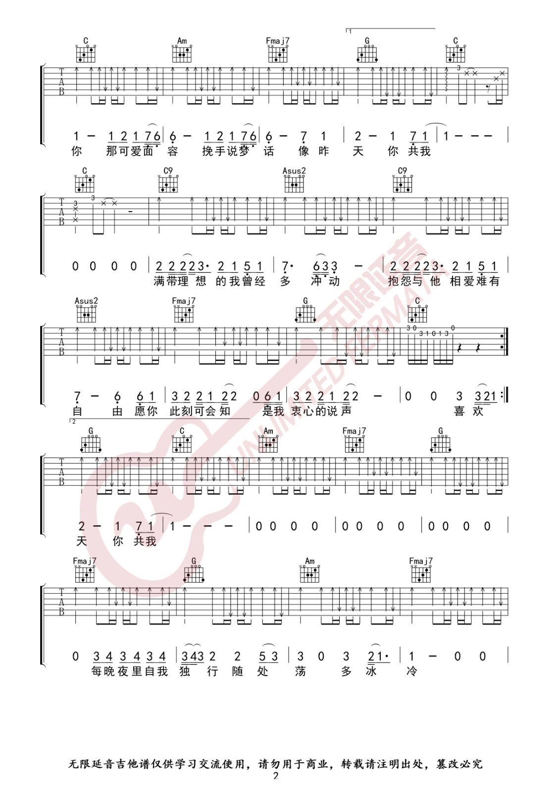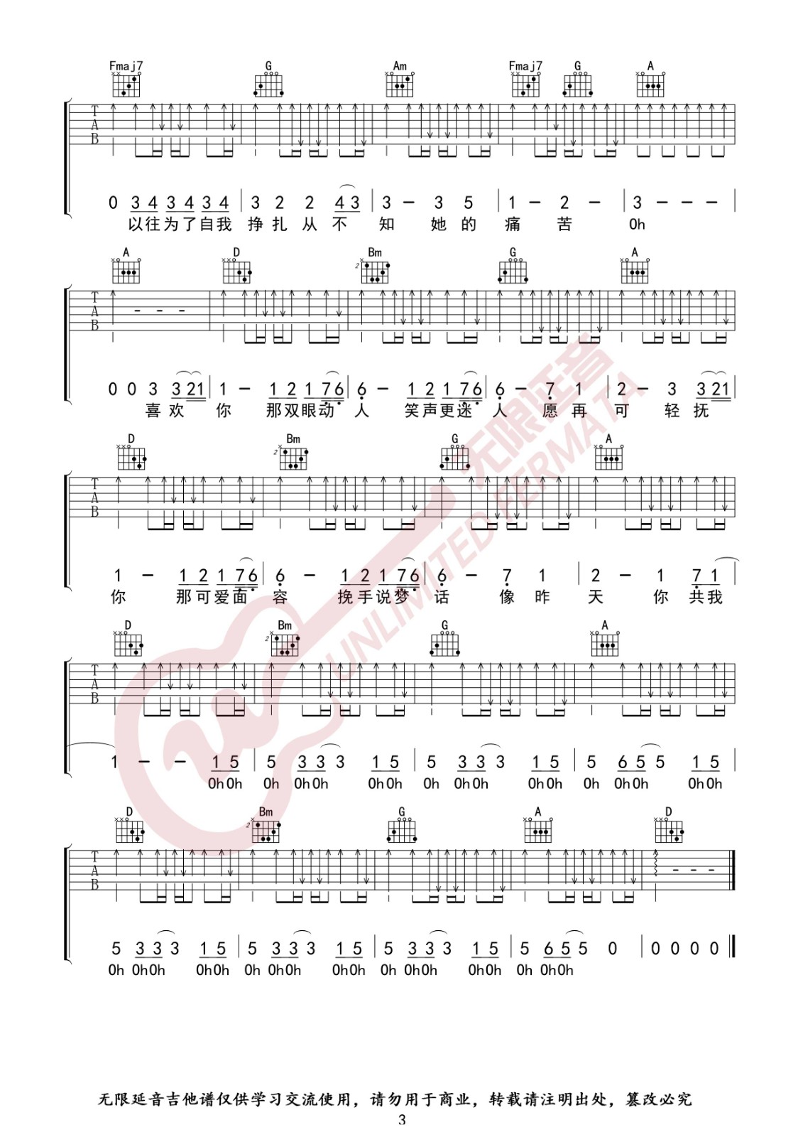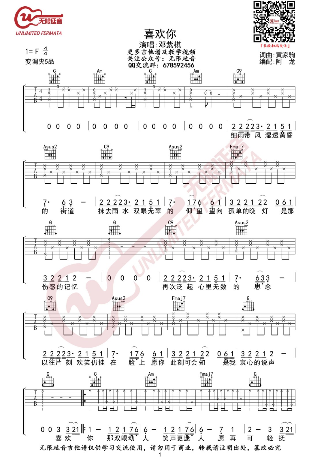 曲谱介绍: 邓紫棋《喜欢你》吉他弹唱谱,采用C调指法编配,无限延音编配出品,共有3张高清图谱。