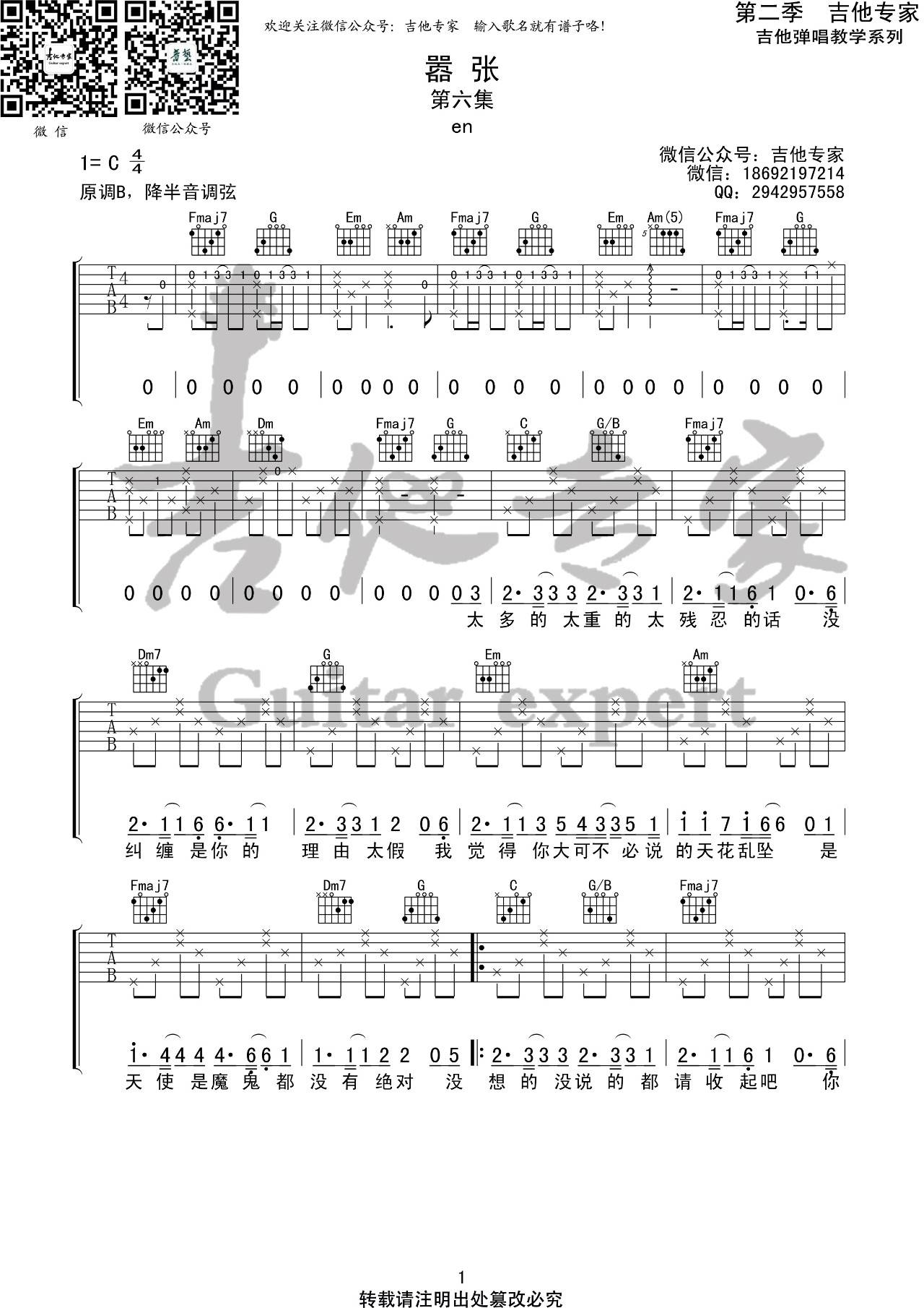曲谱介绍: En《嚣张》吉他弹唱谱,采用C调指法编配,吉他专家编配出品,共有3张高清图谱。