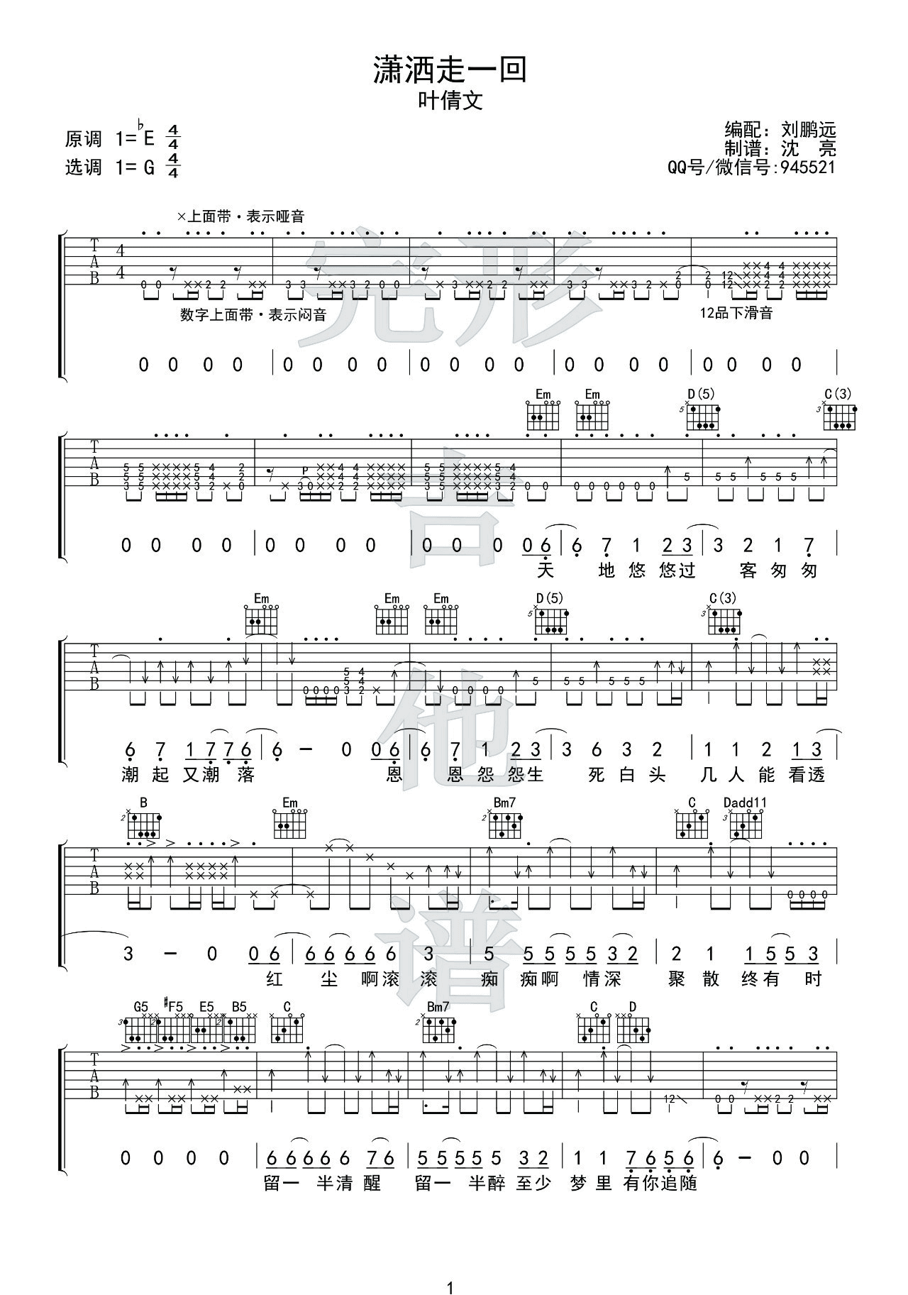 曲谱介绍: 叶倩文《潇洒走一回》吉他弹唱谱,采用G调指法编配,完形吉他编配出品,共有3张高清图谱。