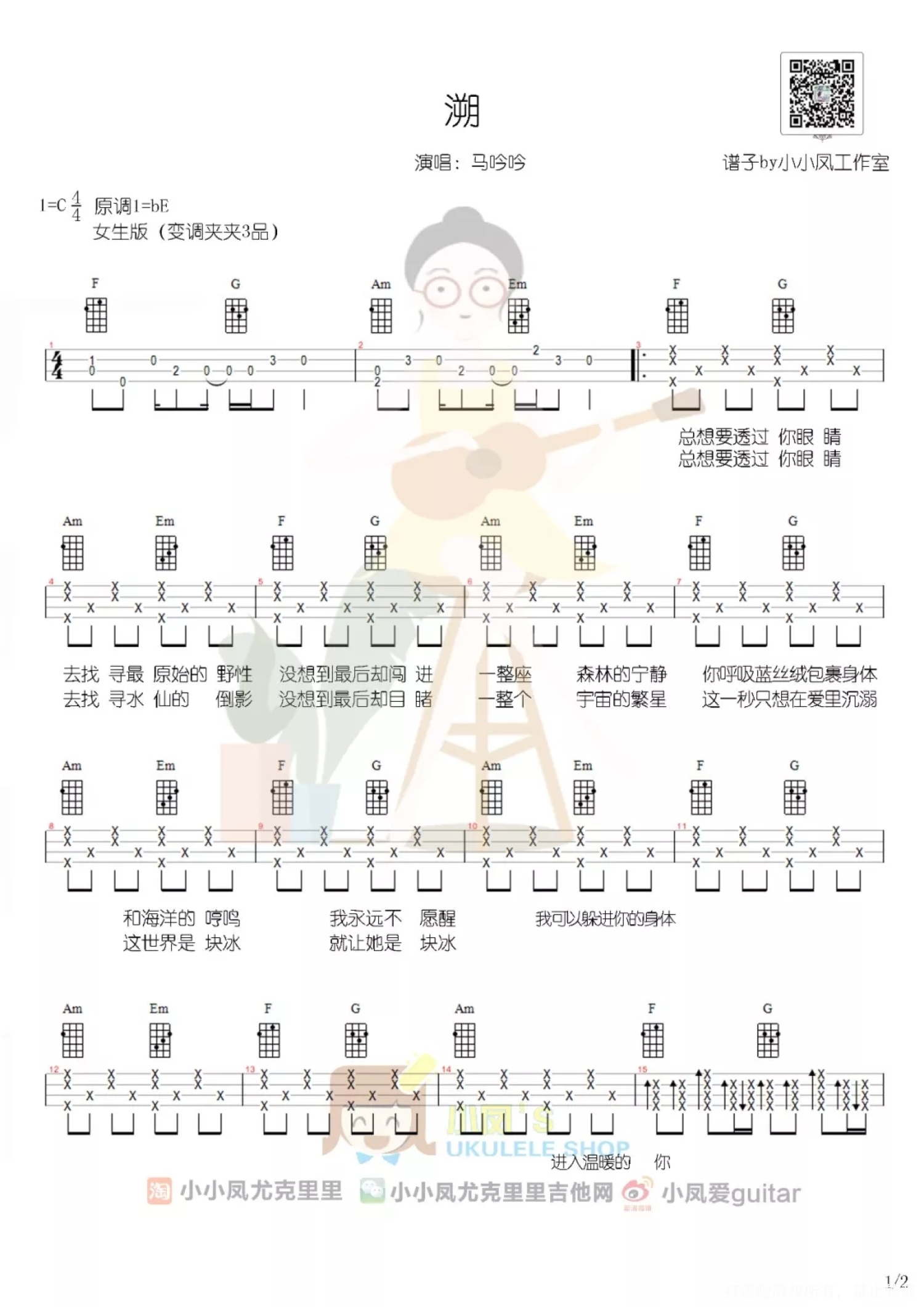 曲谱介绍: 本期选曲是最近在短视频网站爆火的这首《溯》,是由Alan Walker倾心欣赏推荐的中国电音制作人CORSAK制作的。 演唱者为《无名之辈》中饰演真真的云南歌手马吟吟。 CORSAK在制作电音曲目时发现将FUTUREBASS和中文流行歌曲混合后,会产生一种特有东方色彩的电音化学反应。 因此他放弃了与国际厂牌合作的机会,转而潜心创作专属于中国风格的电音曲目。   “小知识科普” Future bass 这类型歌曲的BPM(即拍子数)一般都在每分钟70到95之间,与人每分钟心跳达到相同频率,才能与心跳形成共鸣,所以也才有了让人心动的节奏。   《溯》这首歌曲如同歌名一样,编曲的大气磅礴会让人联想到宇宙、地球、自然界的怀抱。 伴随着马吟吟慵懒的爵士女嗓,逐渐深入的电音鼓点,能够让人一起感受律动,探寻原始的力量。 《溯》的英文名为REVERSE,也就是倒退、逆回。 我可以躲进你的身体,我想透过你眼睛去找寻。人如同初生婴儿,接近生命本源,有一种亲密且温暖的感觉。 这首歌的演唱者马吟吟在社交网站上上传了这首歌视频教学版本,比起原版的电音伴奏来说。虽然没有共振鼓点,但也是一首非常好听的曲目。 所以小凤为大家制作了这首歌的尤克里里曲谱,让大家用小尤来玩一下这首歌,认真练习吧(*^▽^*)!期待大家的作品~   尤克里里弹唱谱● 女生版   尤克里里弹唱谱● 男生版