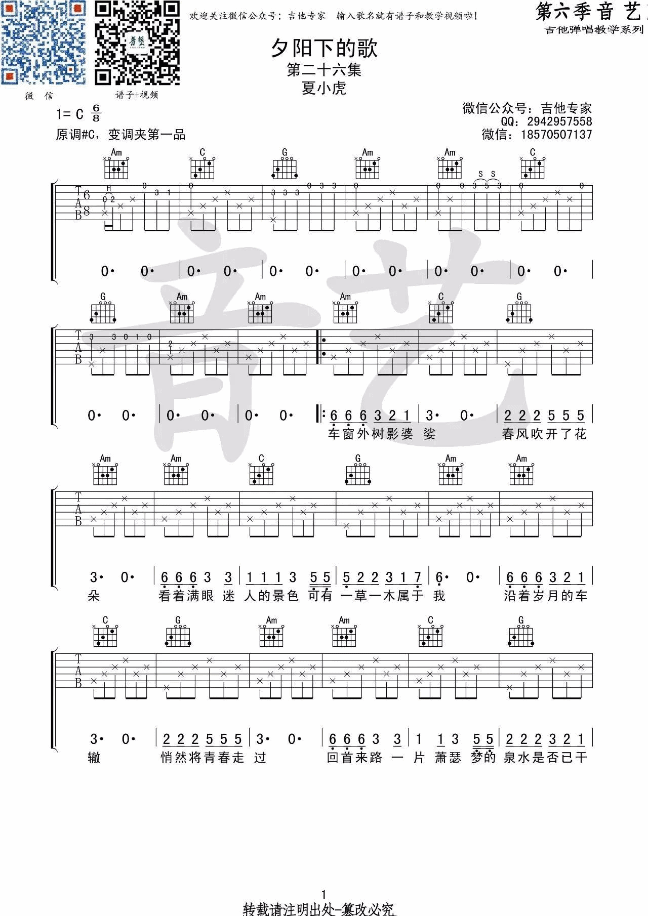 曲谱介绍: 夏小虎《夕阳下的歌》吉他弹唱谱,采用C调指法编配,音艺吉他编配出品,共有3张高清图谱。