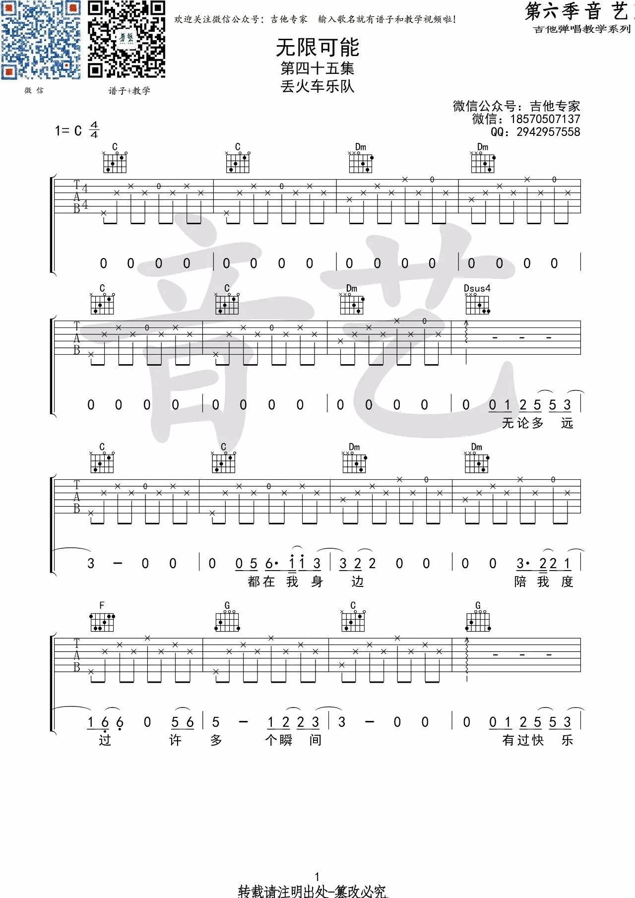 曲谱介绍: 丢火车乐队《无限可能》吉他弹唱谱,采用C调指法编配,音艺吉他编配出品,共有3张高清图谱。