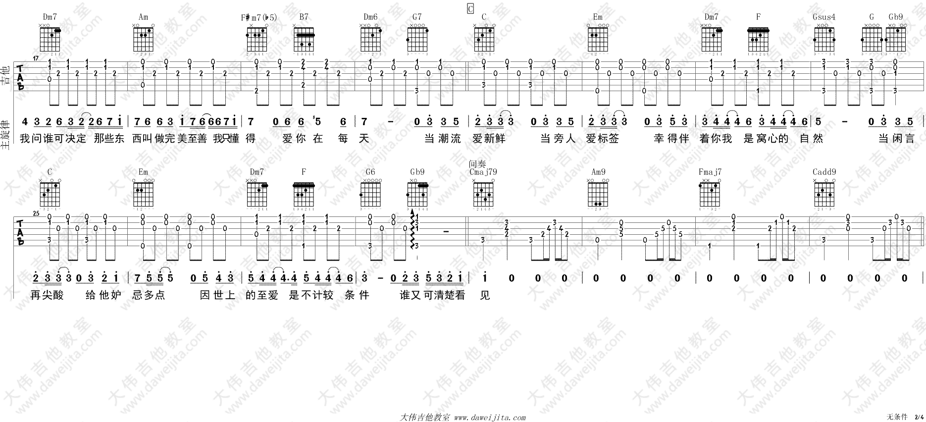 曲谱介绍: 陈奕迅《无条件》吉他弹唱谱,采用C调指法编配,大伟吉他教室编配出品,共有3张高清图谱。