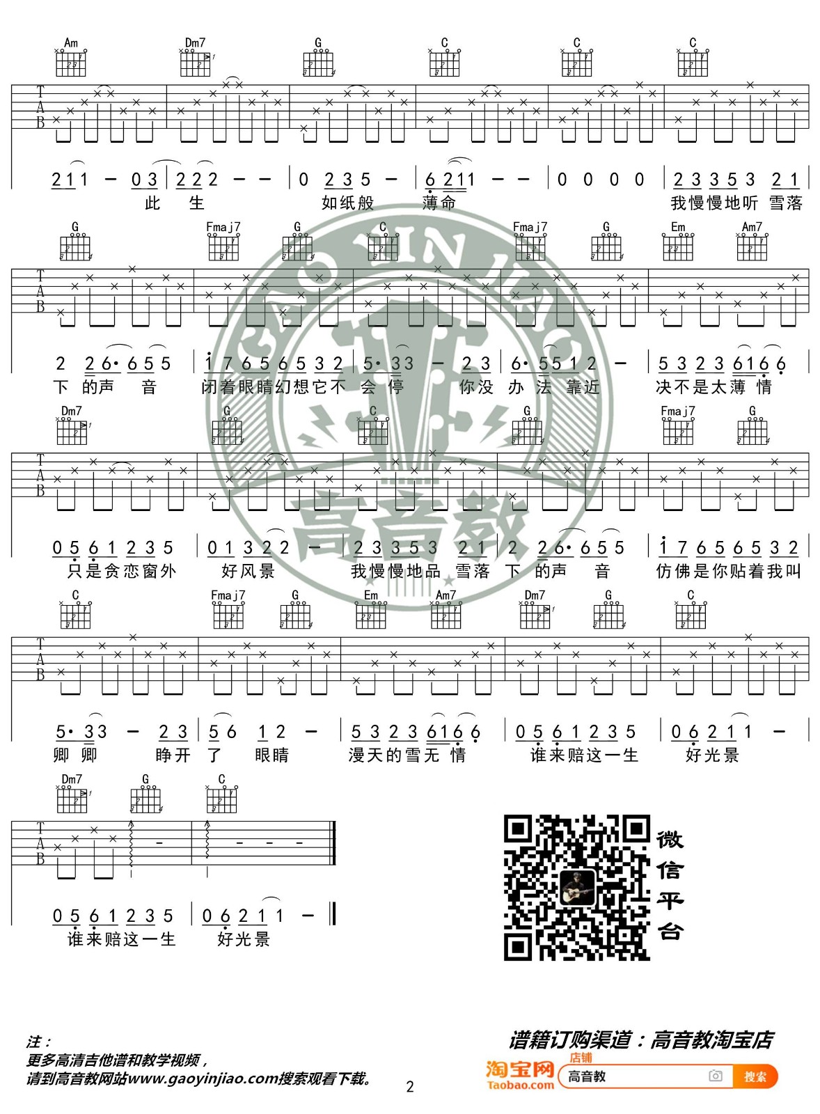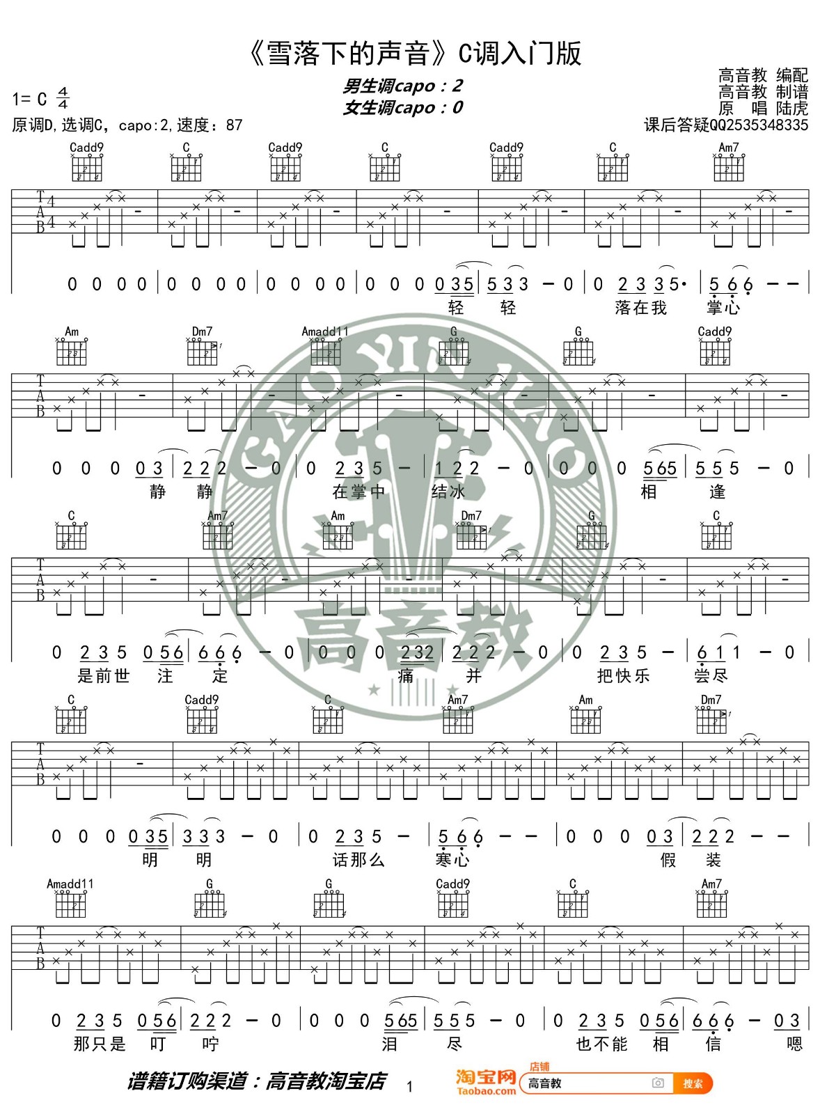 曲谱介绍: 陆虎《雪落下的声音》吉他弹唱谱,采用C调指法编配,高音教编配出品,共有2张高清图谱,免翻页排版设计。