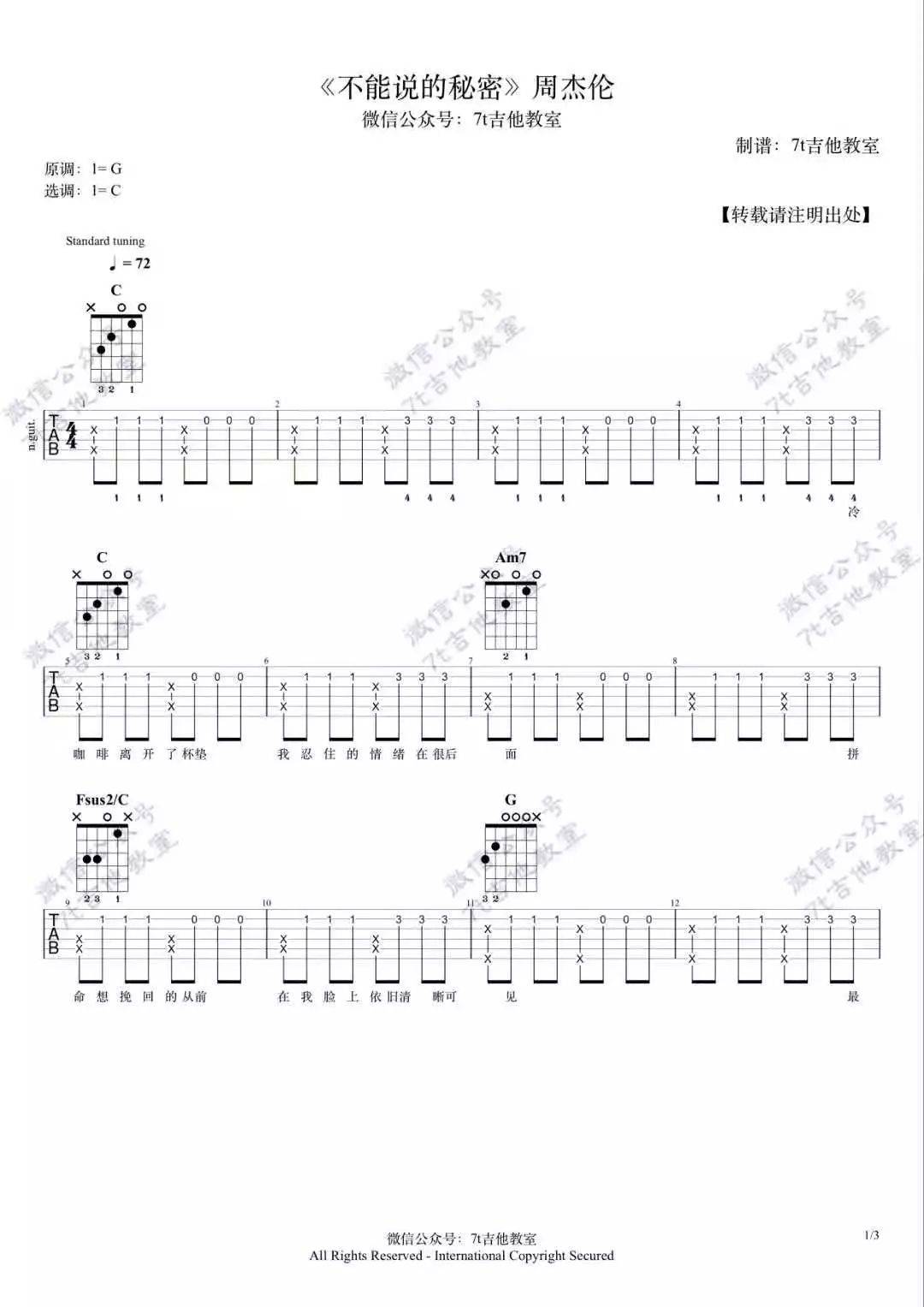曲谱介绍: 周杰伦《不能说的秘密》吉他弹唱谱,采用C调指法编配,7T吉他教室编配出品,共有3张高清图谱。