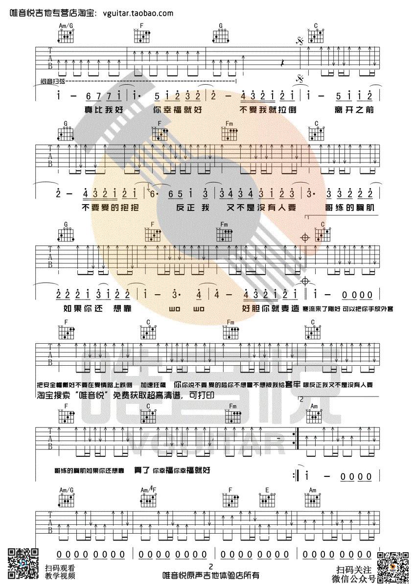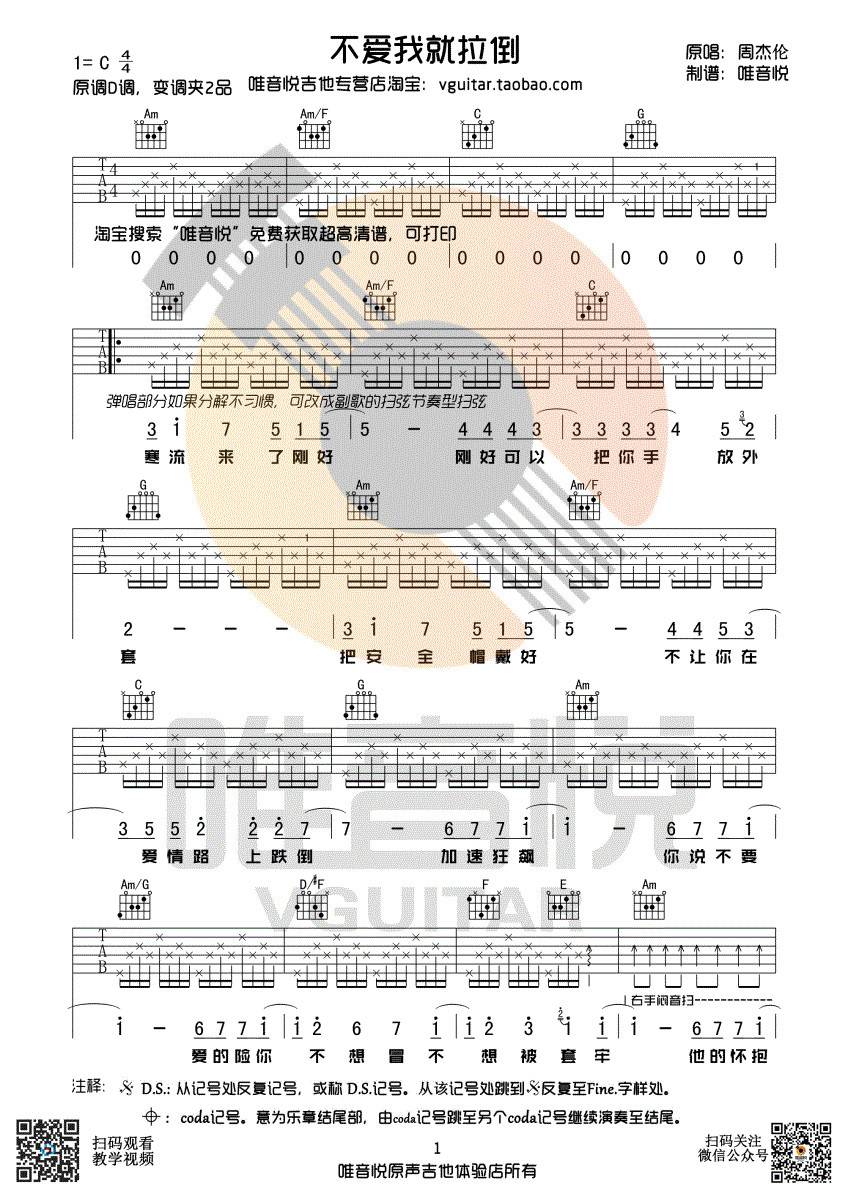 曲谱介绍: 周杰伦《不爱我就拉倒》吉他弹唱谱,采用C调指法编配,唯音悦编配出品,共有3张高清图谱。