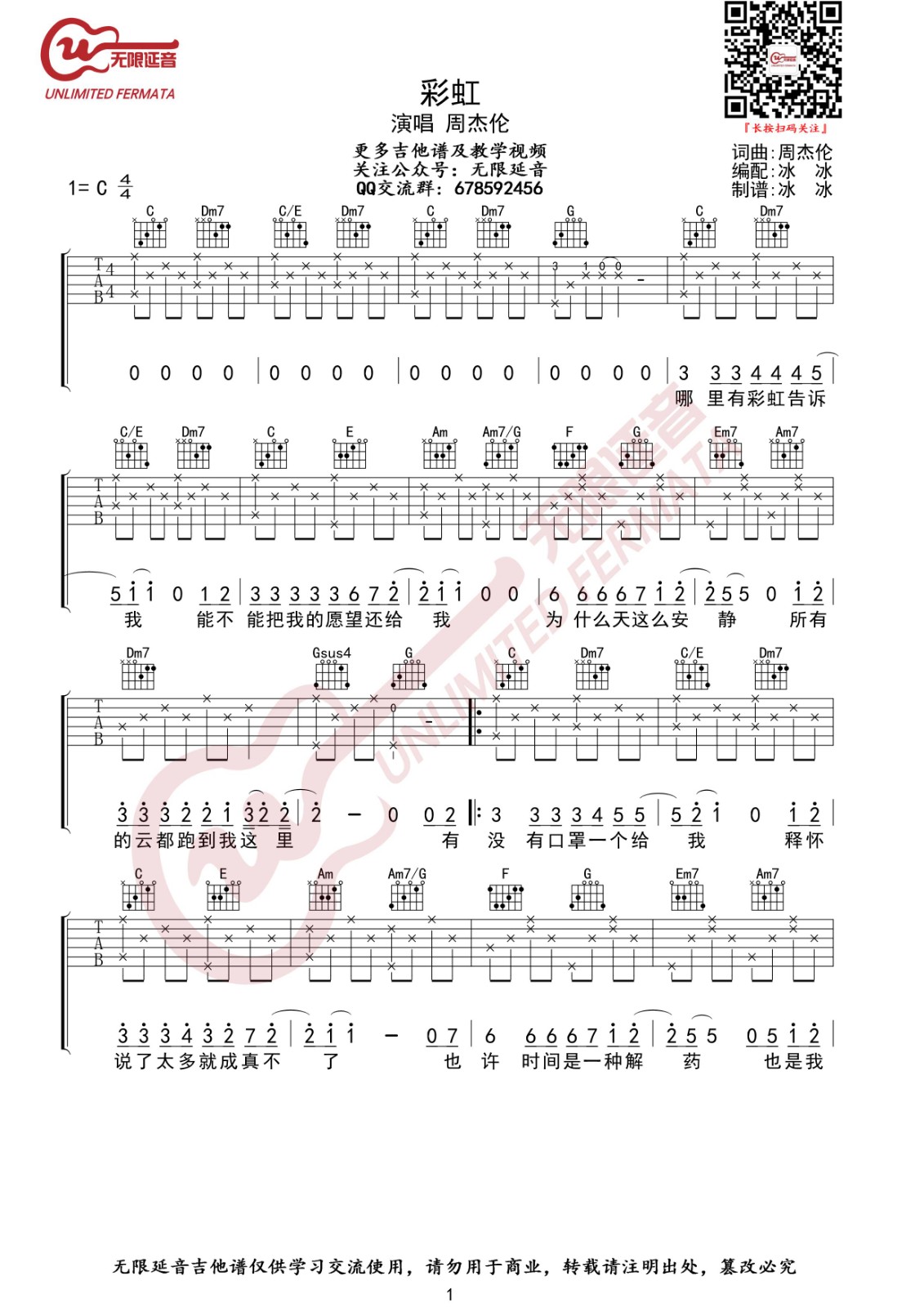 曲谱介绍: 周杰伦《彩虹》吉他弹唱谱,采用C调指法编配,无限延音编配出品,共有3张高清图谱。