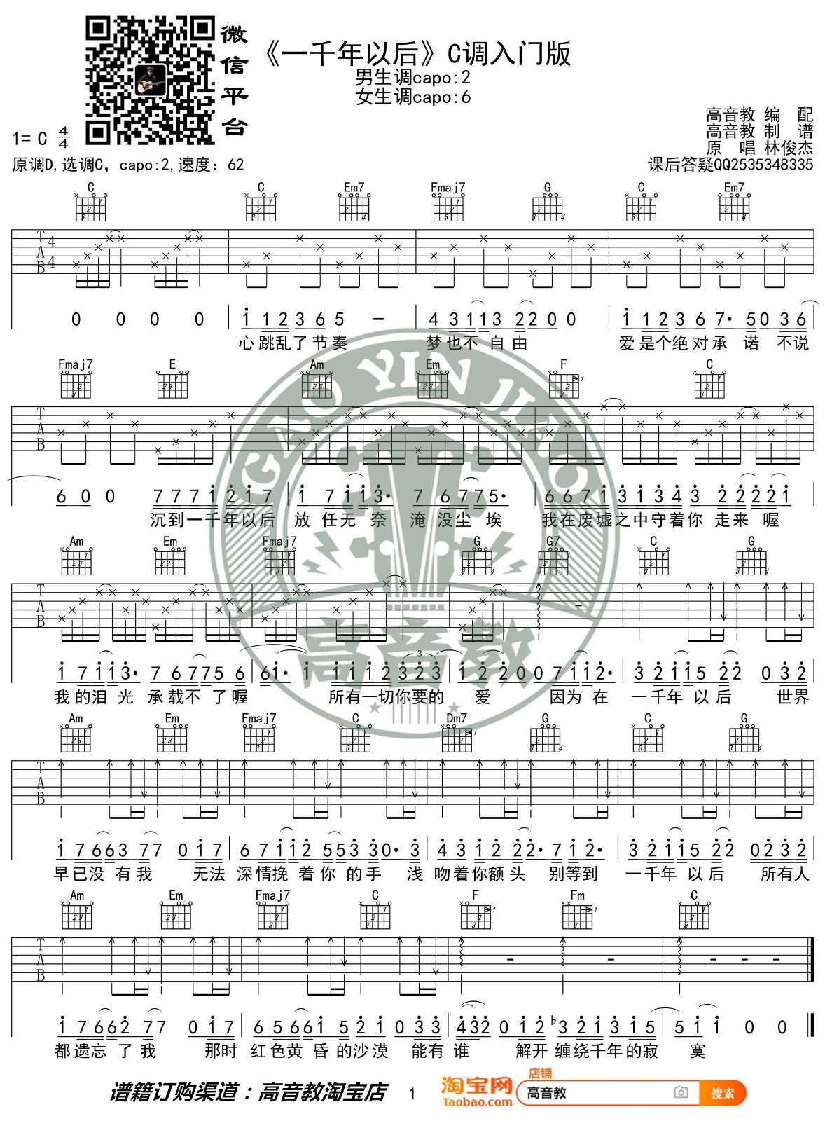 曲谱介绍: 林俊杰《一千年以后》吉他弹唱谱,采用C调指法编配,高音教编配出品,共有1张高清图谱,免翻页排版设计。