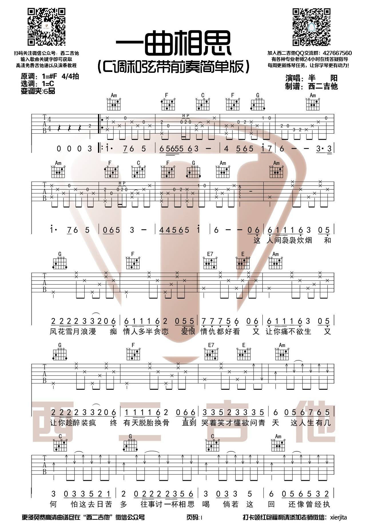 曲谱介绍: 半阳《一曲相思》吉他弹唱谱,采用C调指法编配,西二吉他编配出品,共有2张高清图谱,免翻页排版设计。