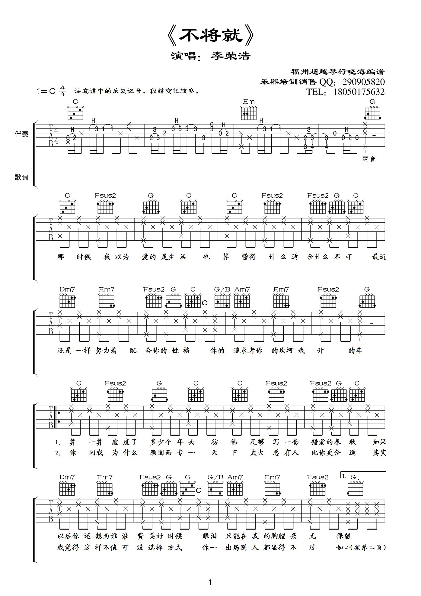 曲谱介绍: 李荣浩《不将就》吉他弹唱谱,采用C调指法编配,超越琴行编配出品,共有3张高清图谱。