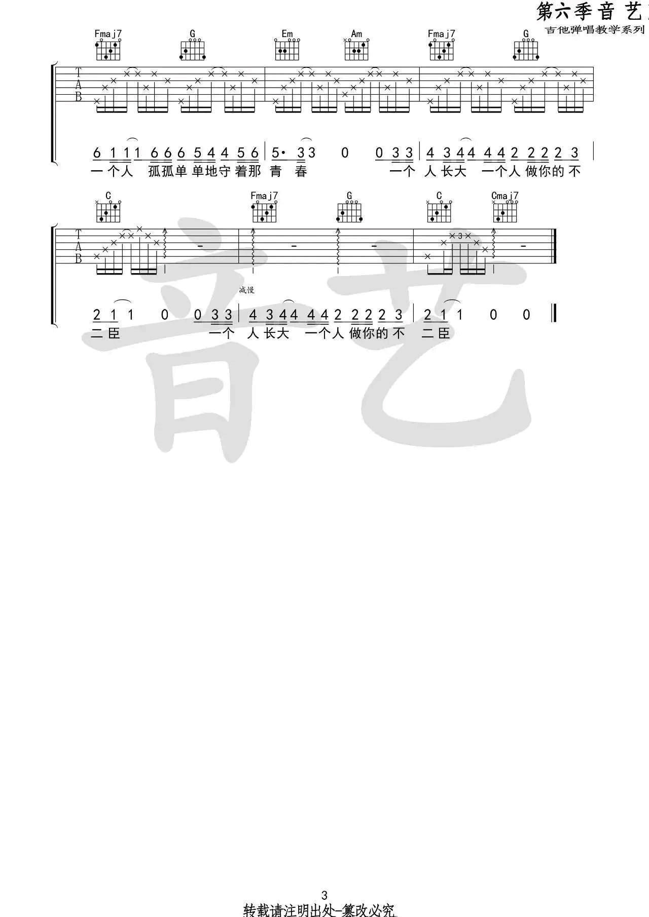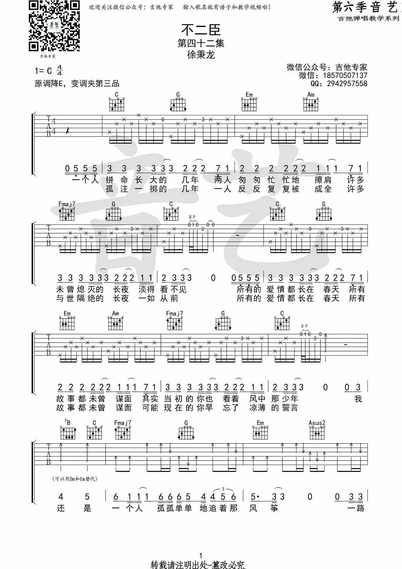 曲谱介绍: 徐秉龙《不二臣》吉他弹唱谱,采用C调指法编配,音艺吉他编配出品,共有3张高清图谱。