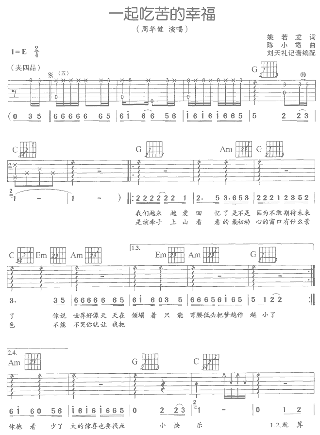 曲谱介绍: 周华健《一起吃苦的幸福》吉他弹唱谱,采用E调指法编配,刘天礼编配出品,共有2张高清图谱,免翻页排版设计。
