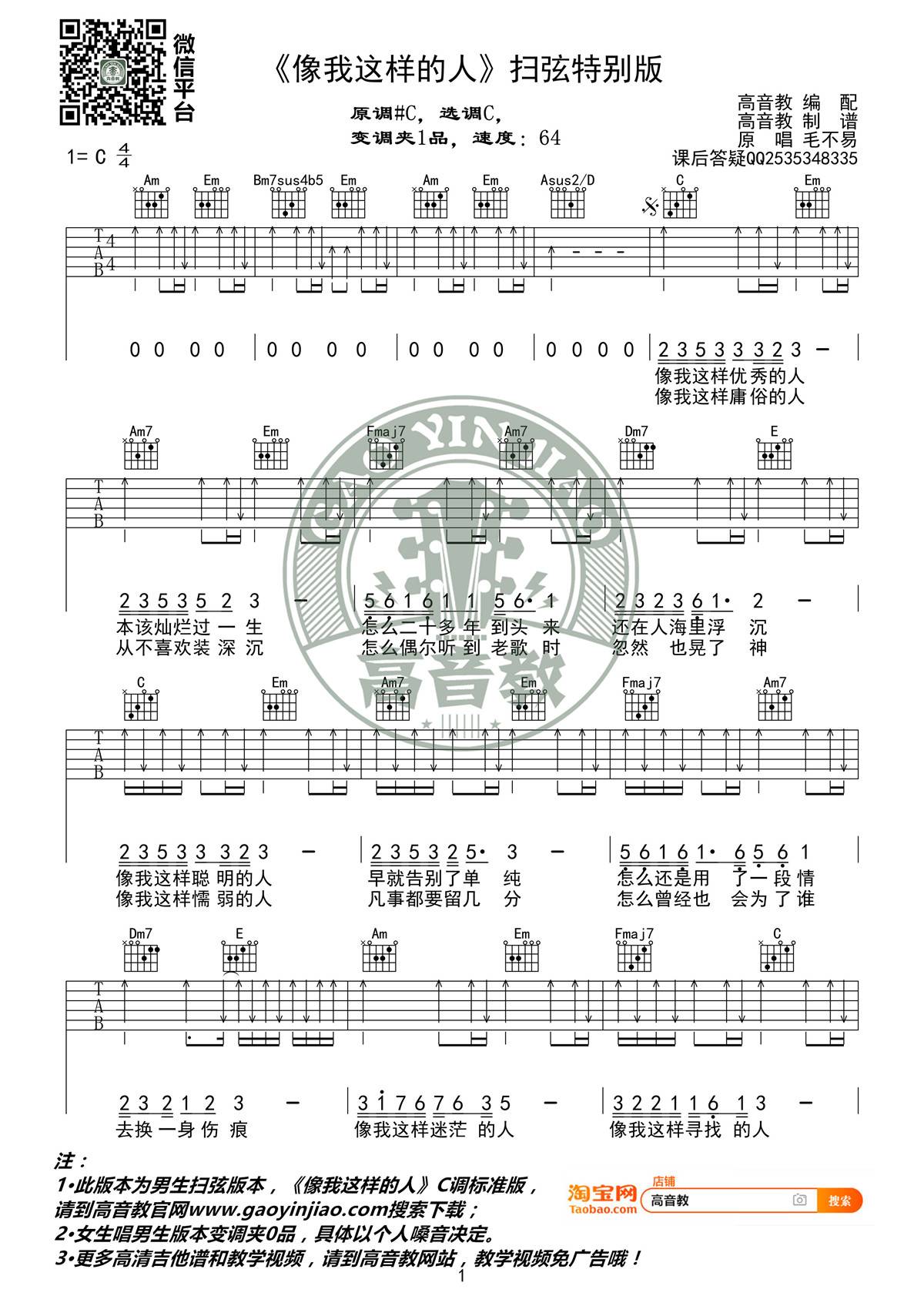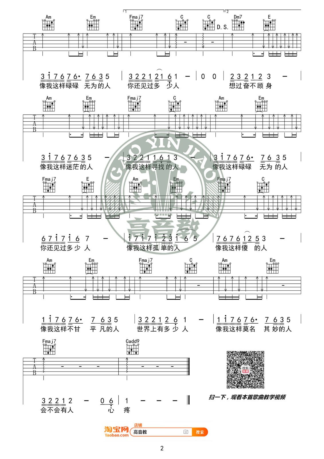 曲谱介绍: 毛不易《像我这样的人》吉他弹唱谱,采用C调指法编配,高音教编配出品,共有2张高清图谱,免翻页排版设计。