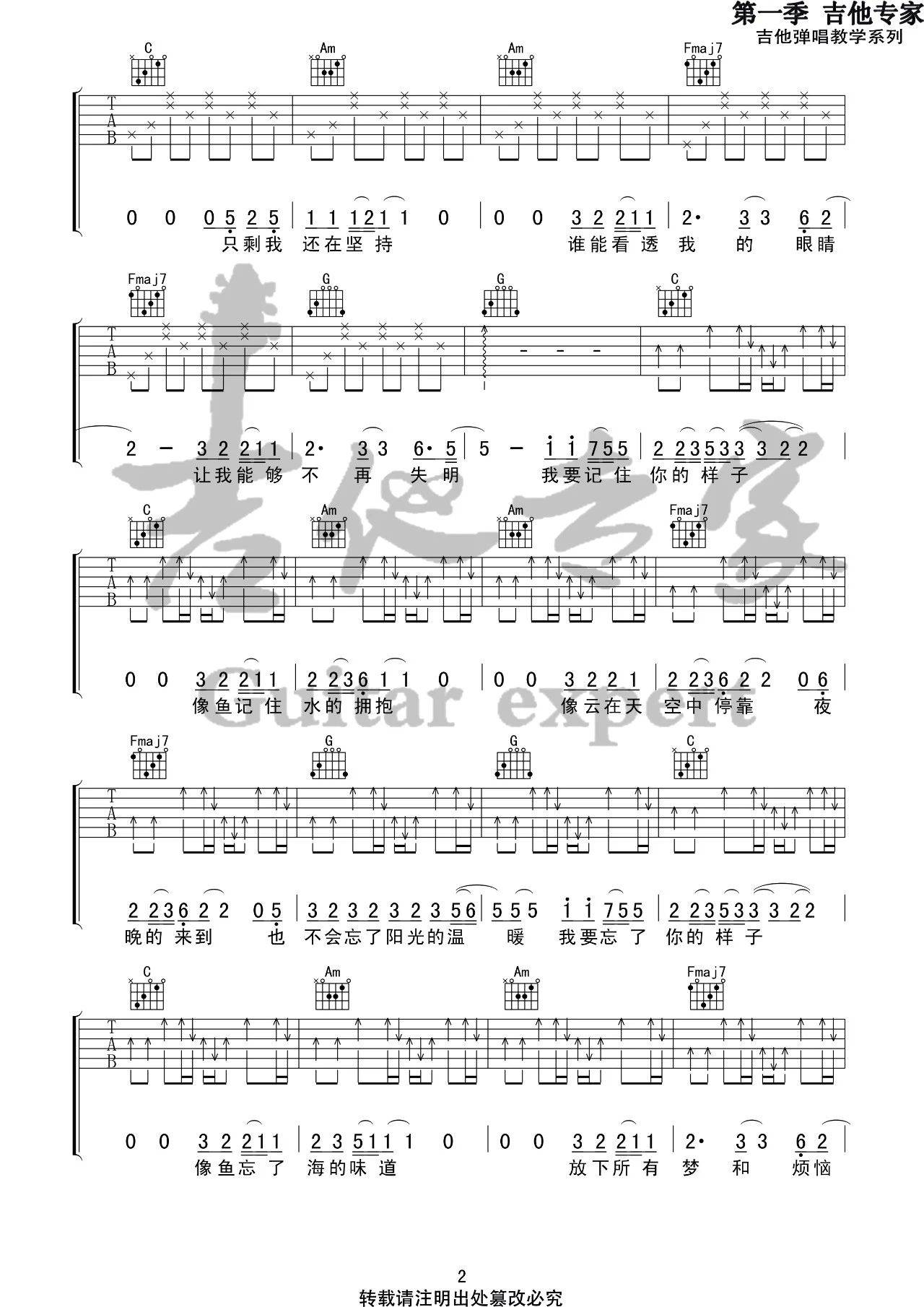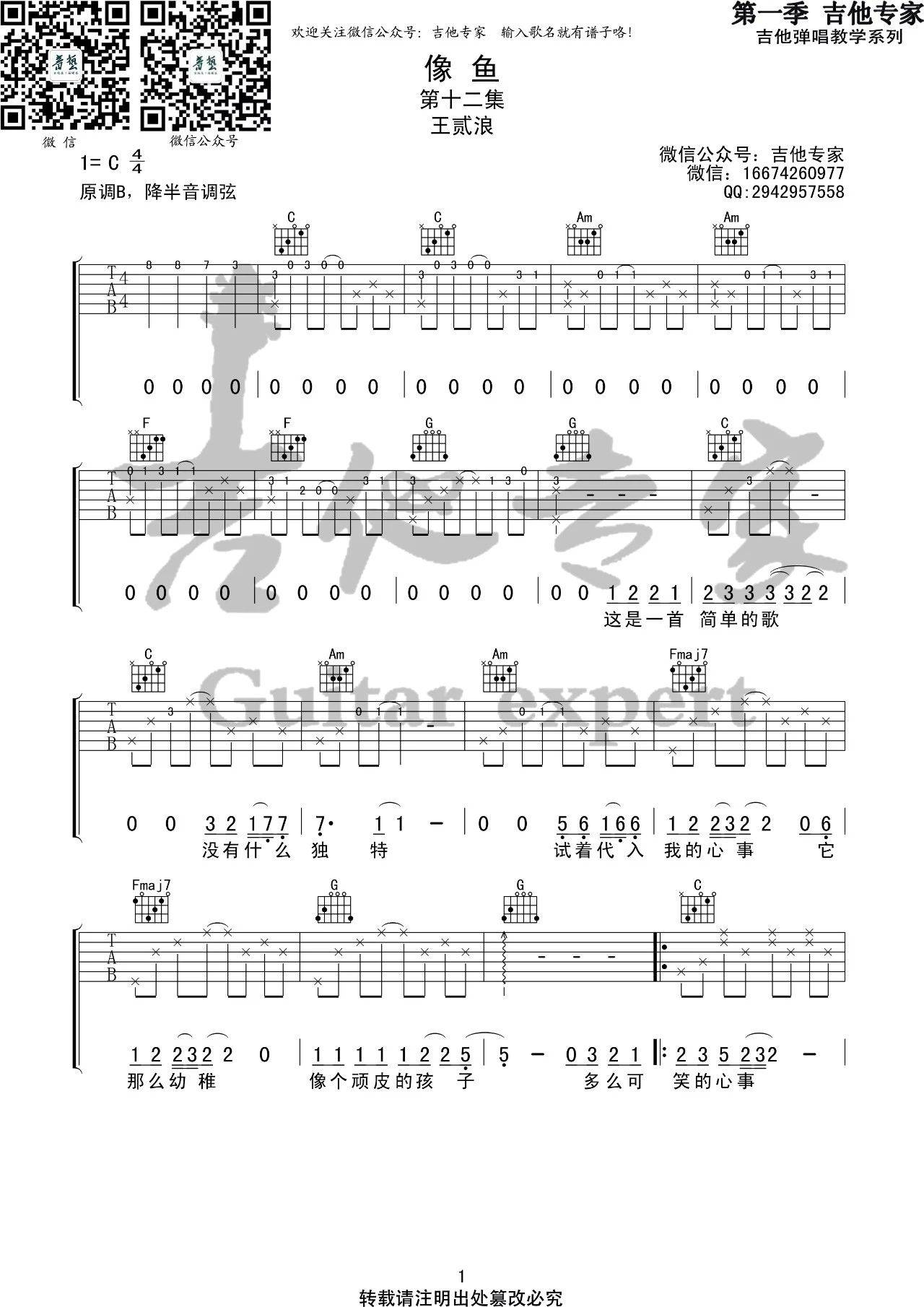 曲谱介绍: 王贰浪《像鱼》吉他弹唱谱,采用C调指法编配,音艺吉他编配出品,共有3张高清图谱。