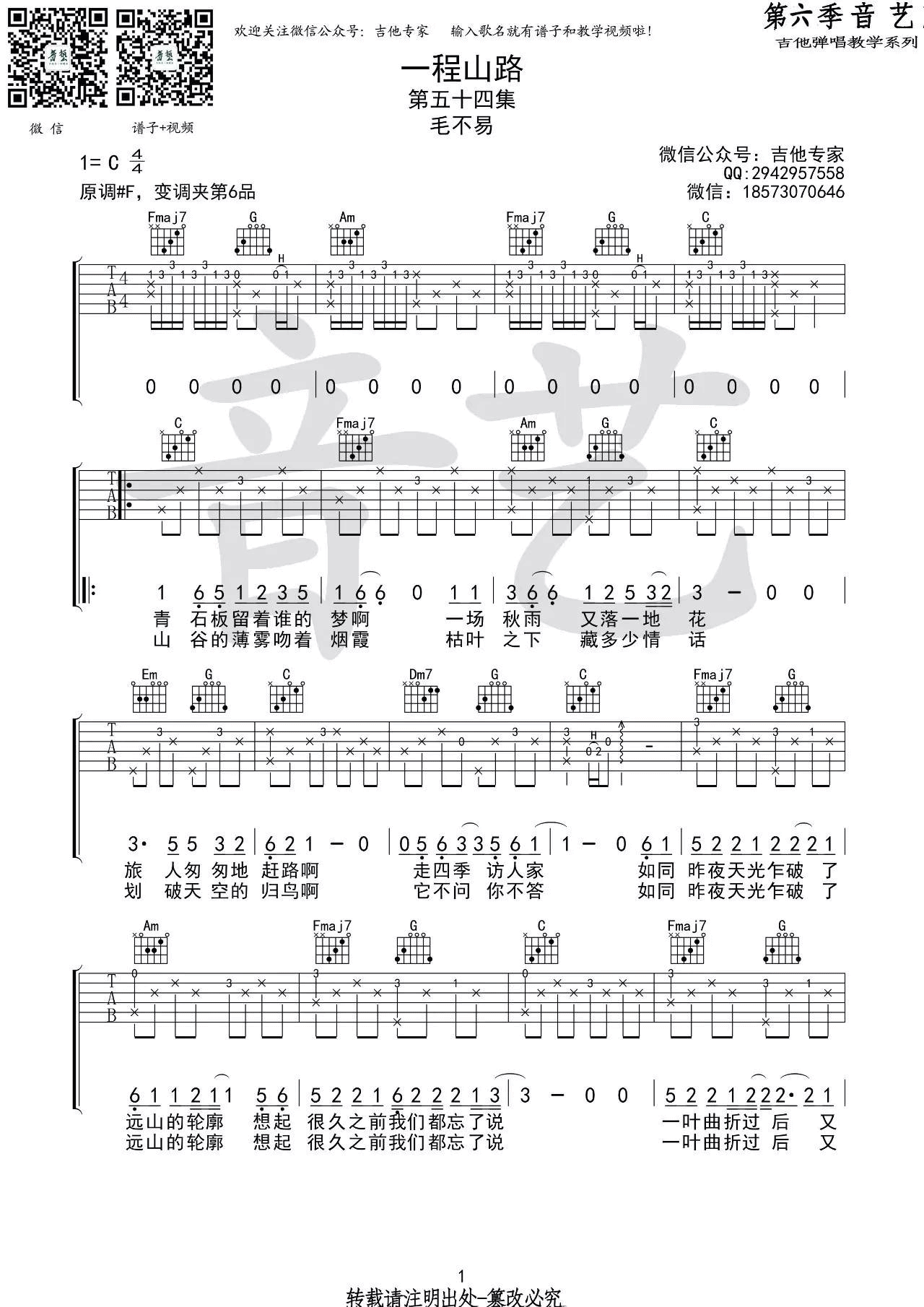 曲谱介绍: 毛不易《一程山路》吉他弹唱谱,采用C调指法编配,音艺吉他编配出品,共有2张高清图谱,免翻页排版设计。