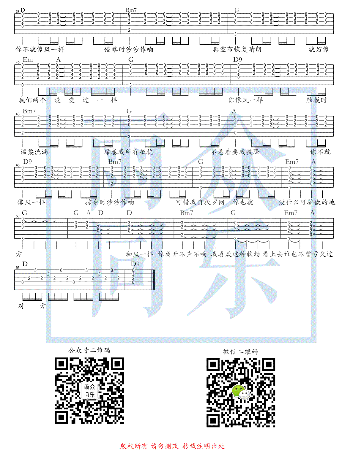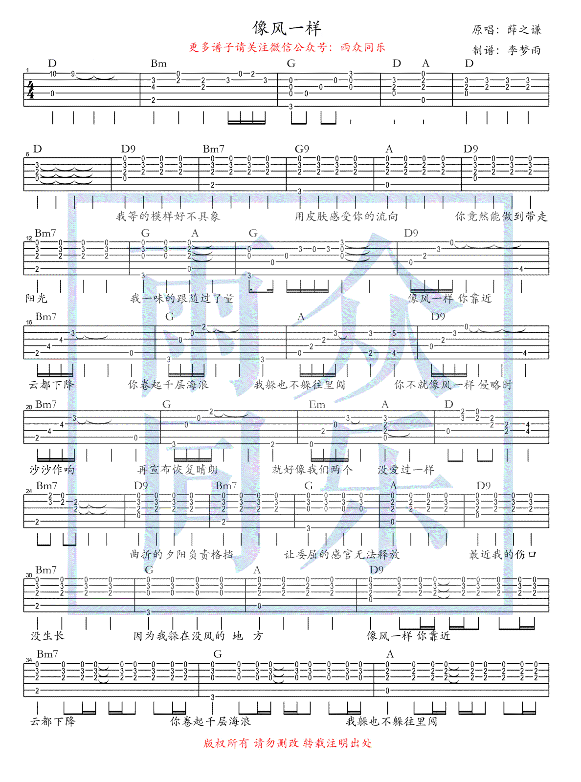 曲谱介绍: 薛之谦《像风一样》吉他弹唱谱,采用D调指法编配,雨众同乐编配出品,共有2张高清图谱,免翻页排版设计。