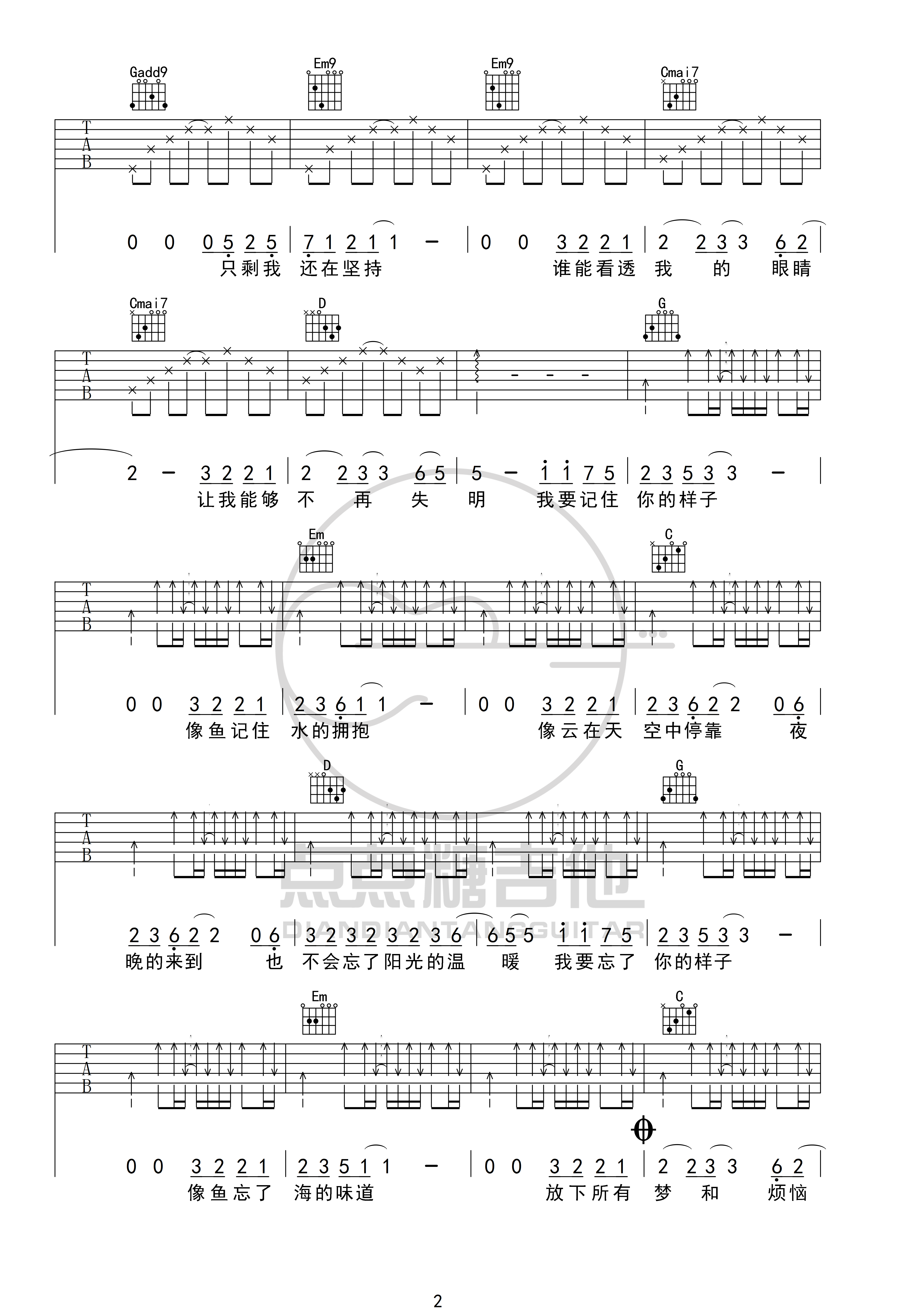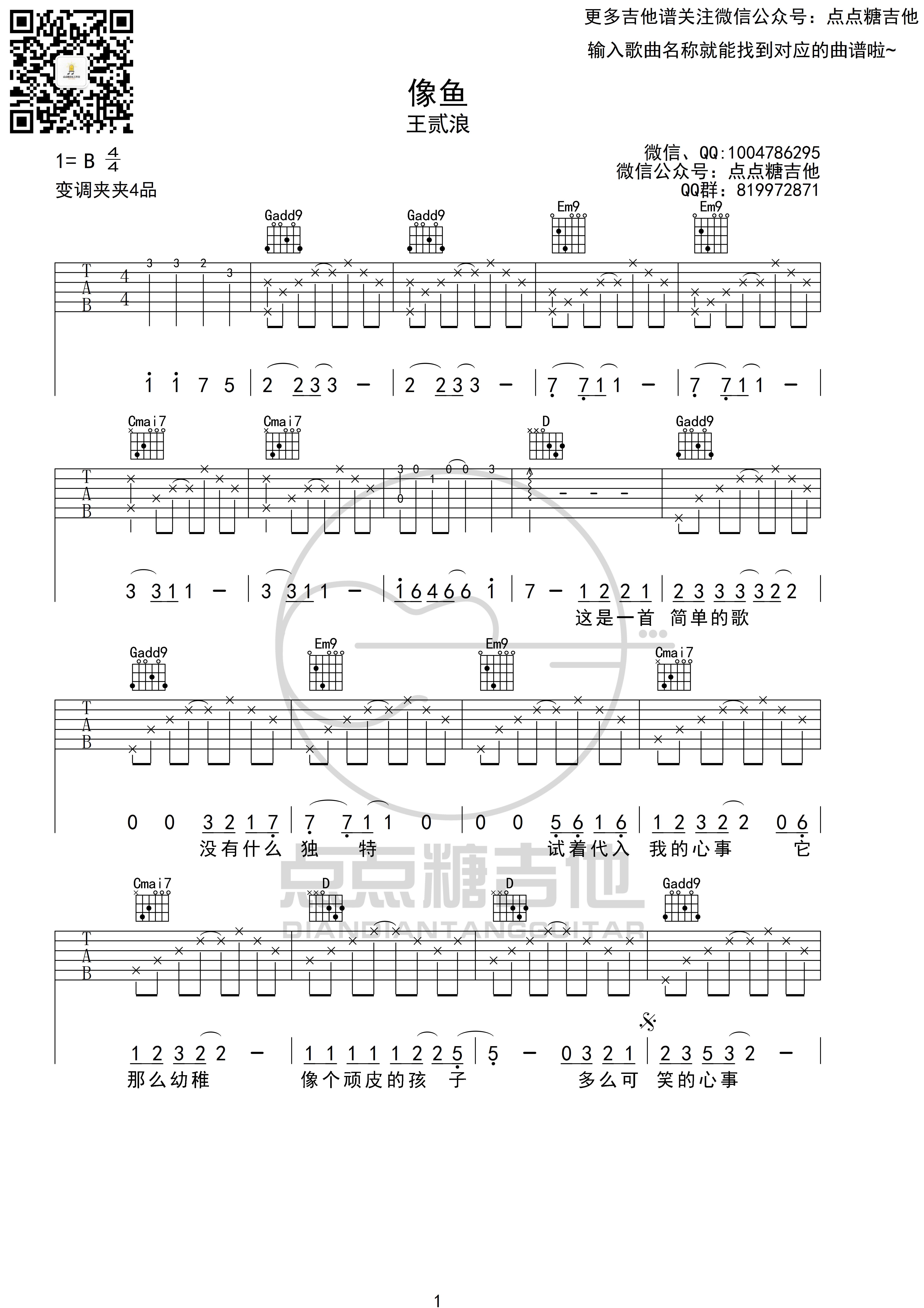 曲谱介绍: 王贰浪《像鱼》吉他弹唱谱,采用G调指法编配,点点糖吉他编配出品,共有3张高清图谱。