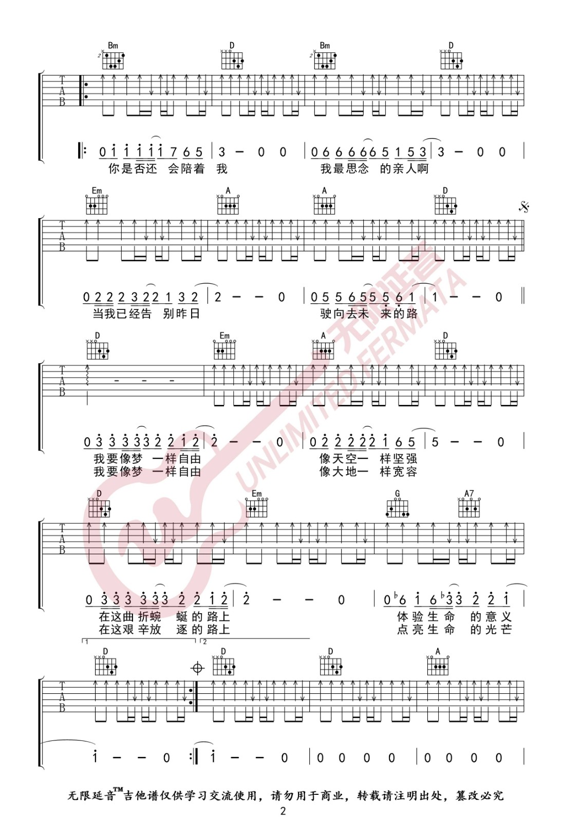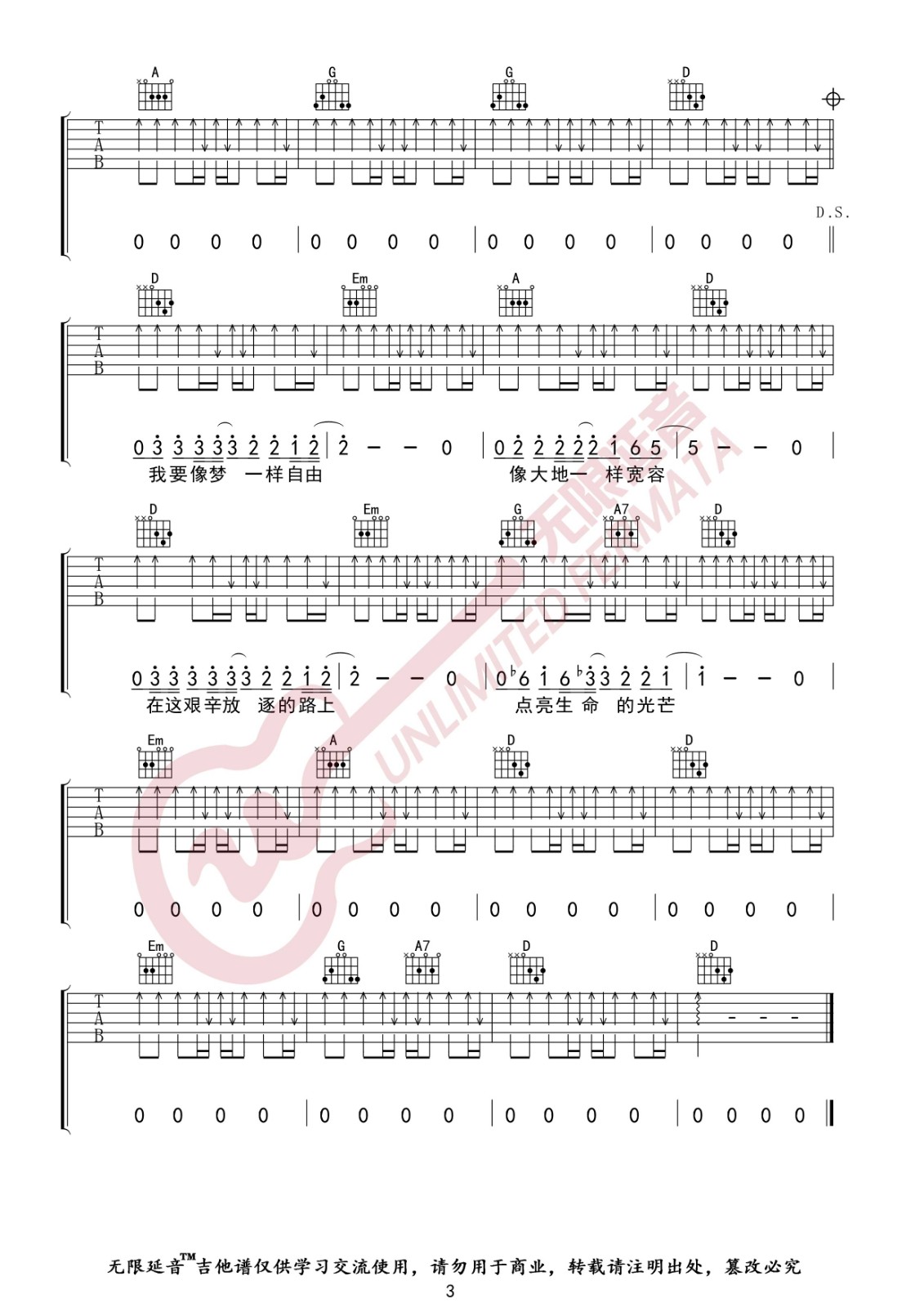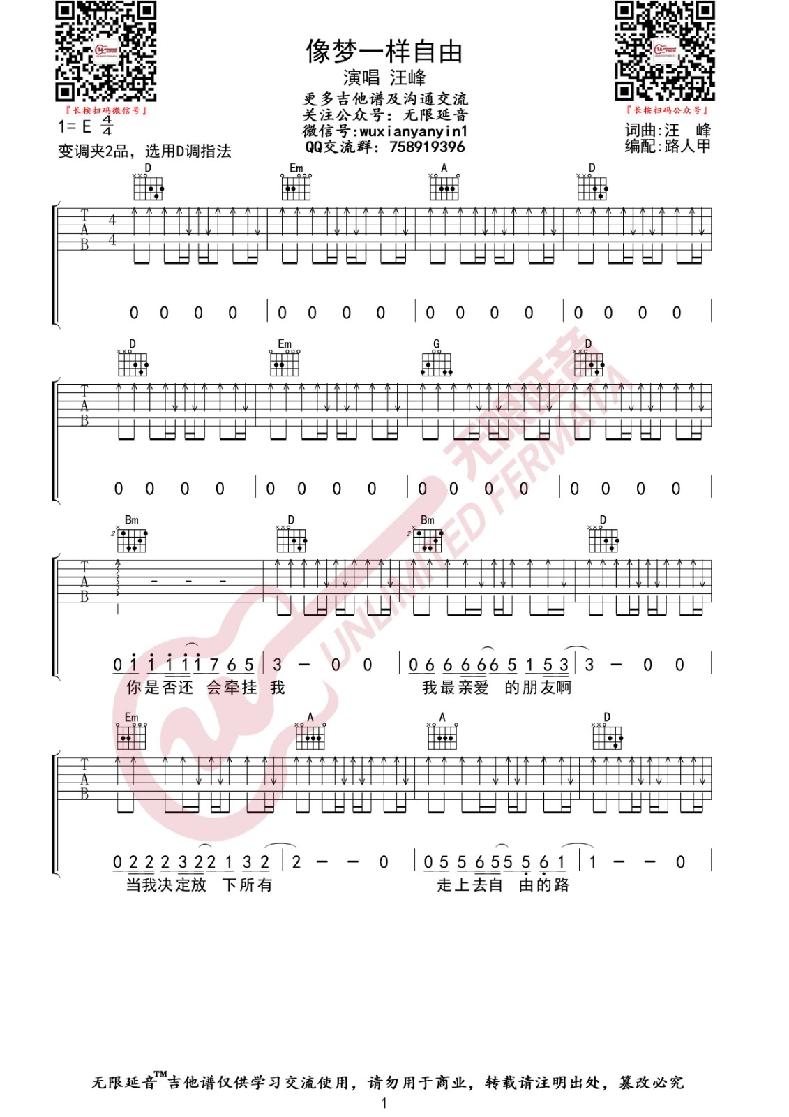 曲谱介绍: 汪峰《像梦一样自由》吉他弹唱谱,采用D调指法编配,无限延音编配出品,共有3张高清图谱。