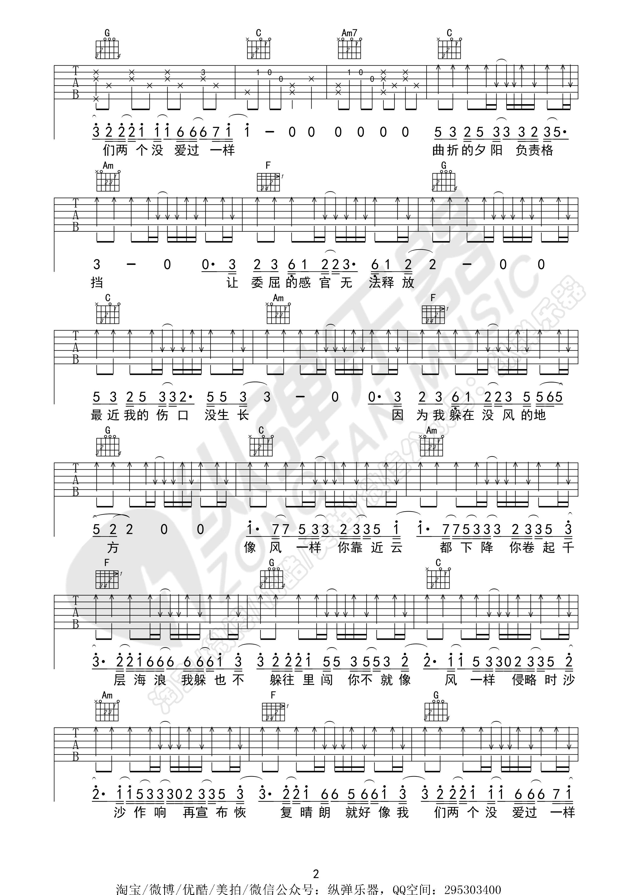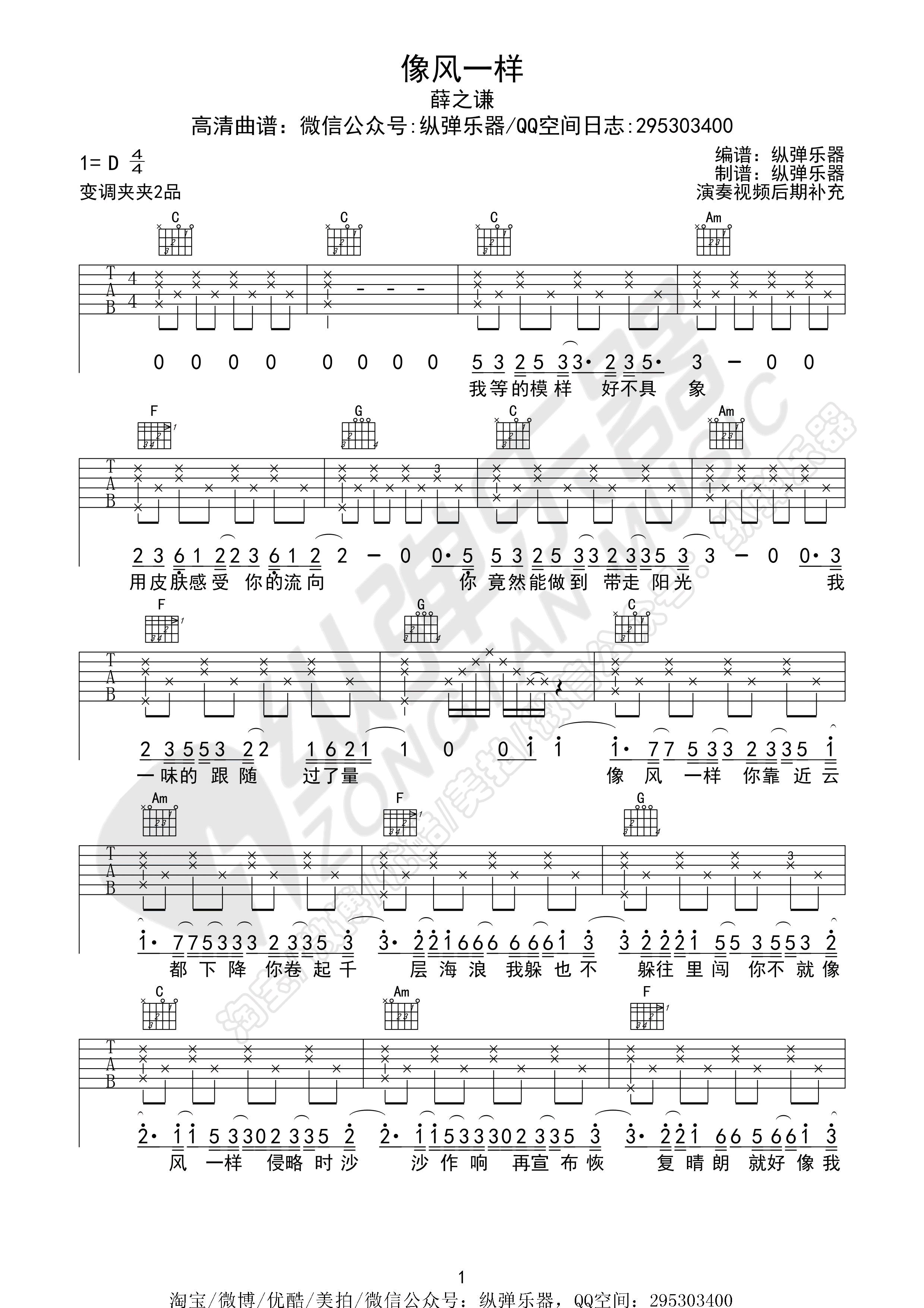 曲谱介绍: 薛之谦《像风一样》吉他弹唱谱,采用D调指法编配,纵弹乐器编配出品,共有3张高清图谱。