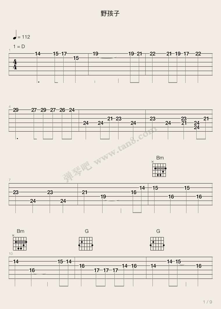 曲谱介绍: 杨千嬅《野孩子》吉他弹唱谱,采用D调指法编配,弹琴吧编配出品,共有9张高清图谱。
