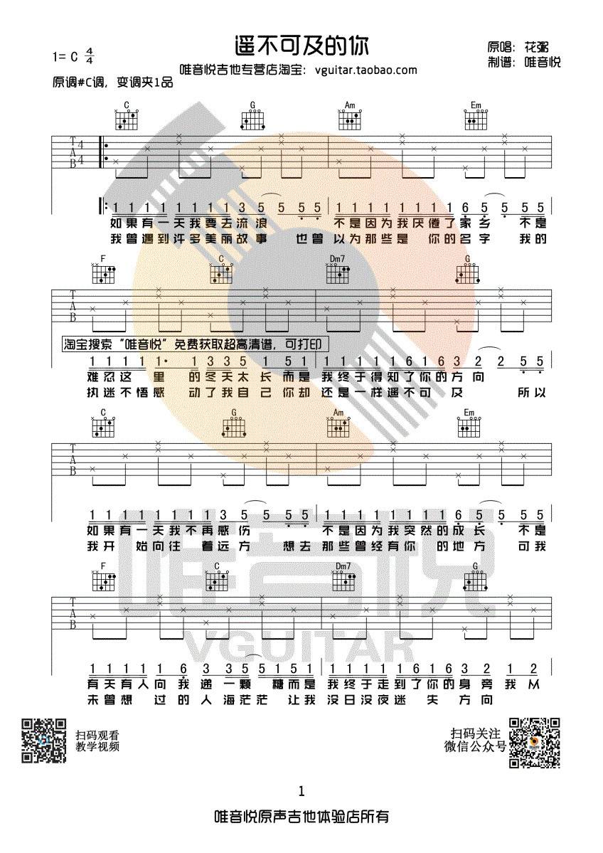 曲谱介绍: 花粥《遥不可及的你》吉他弹唱谱,采用C调指法编配,唯音悦编配出品,共有2张高清图谱,免翻页排版设计。