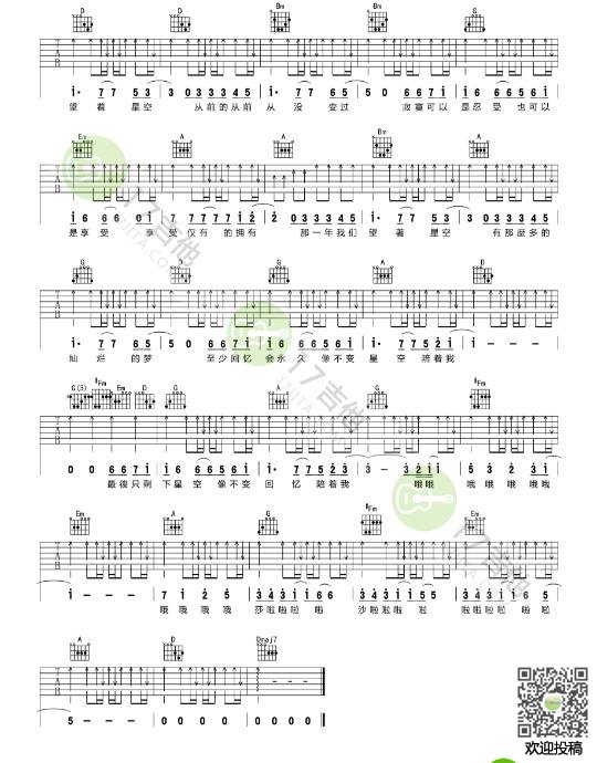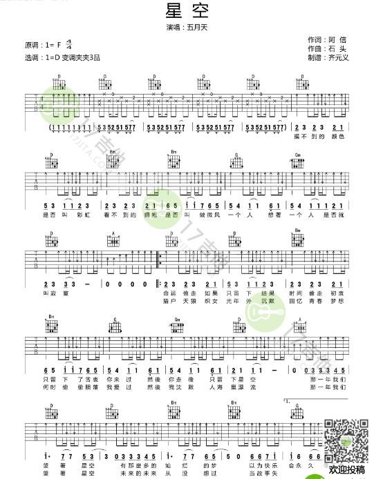 曲谱介绍: 附前奏《星空》吉他弹唱谱,采用D调指法编配,共有3张高清图谱。