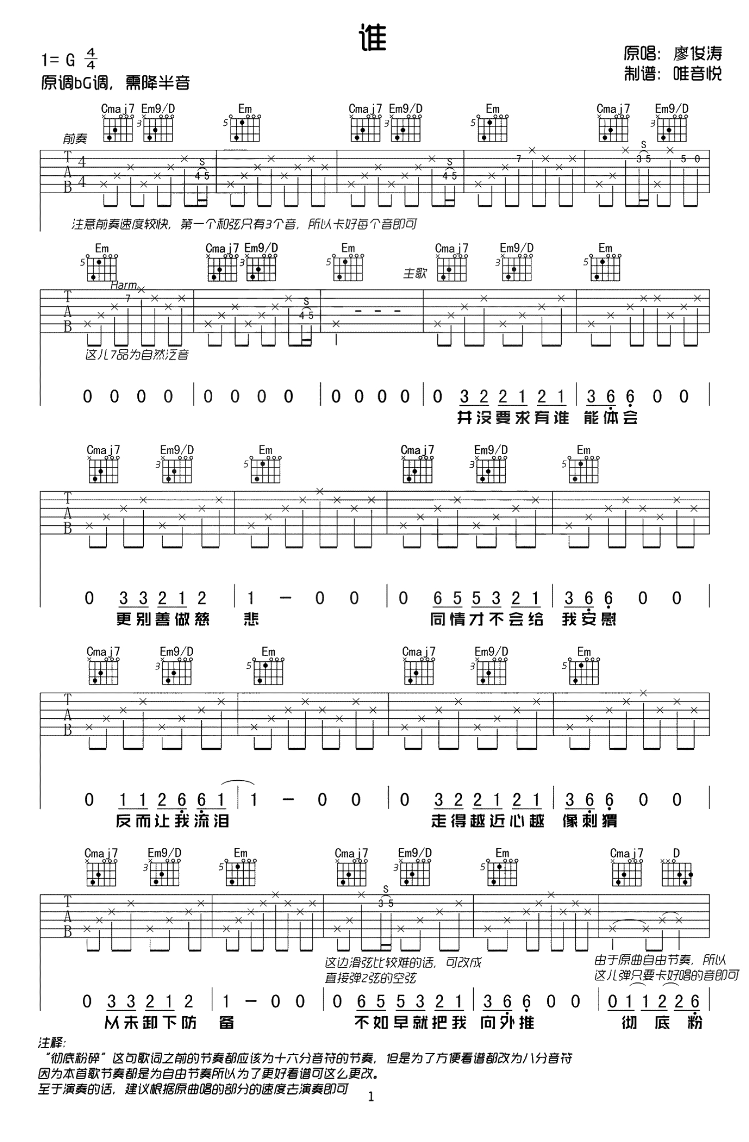 谁吉他谱 - 廖俊涛 - G调吉他弹唱谱