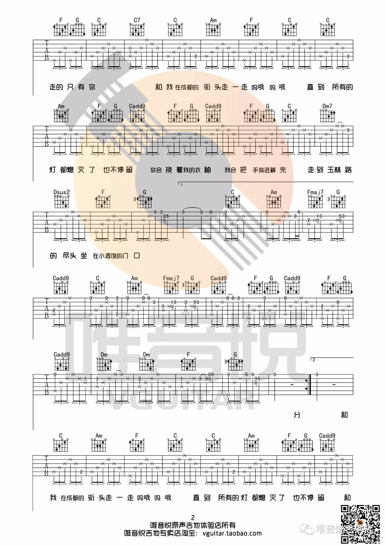曲谱介绍: 赵雷《写给成都的歌》吉他弹唱谱,采用C调指法编配,唯音悦编配出品,共有3张高清图谱。