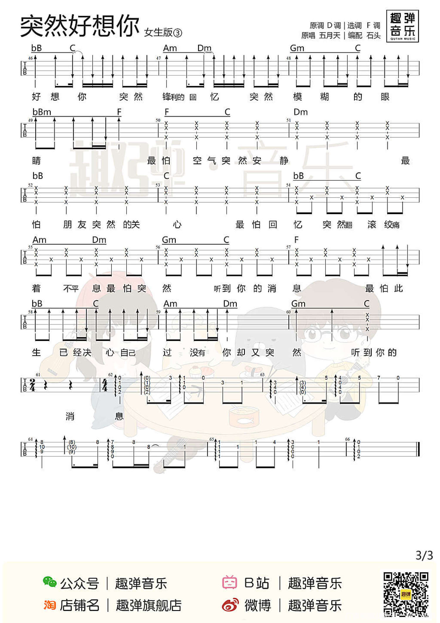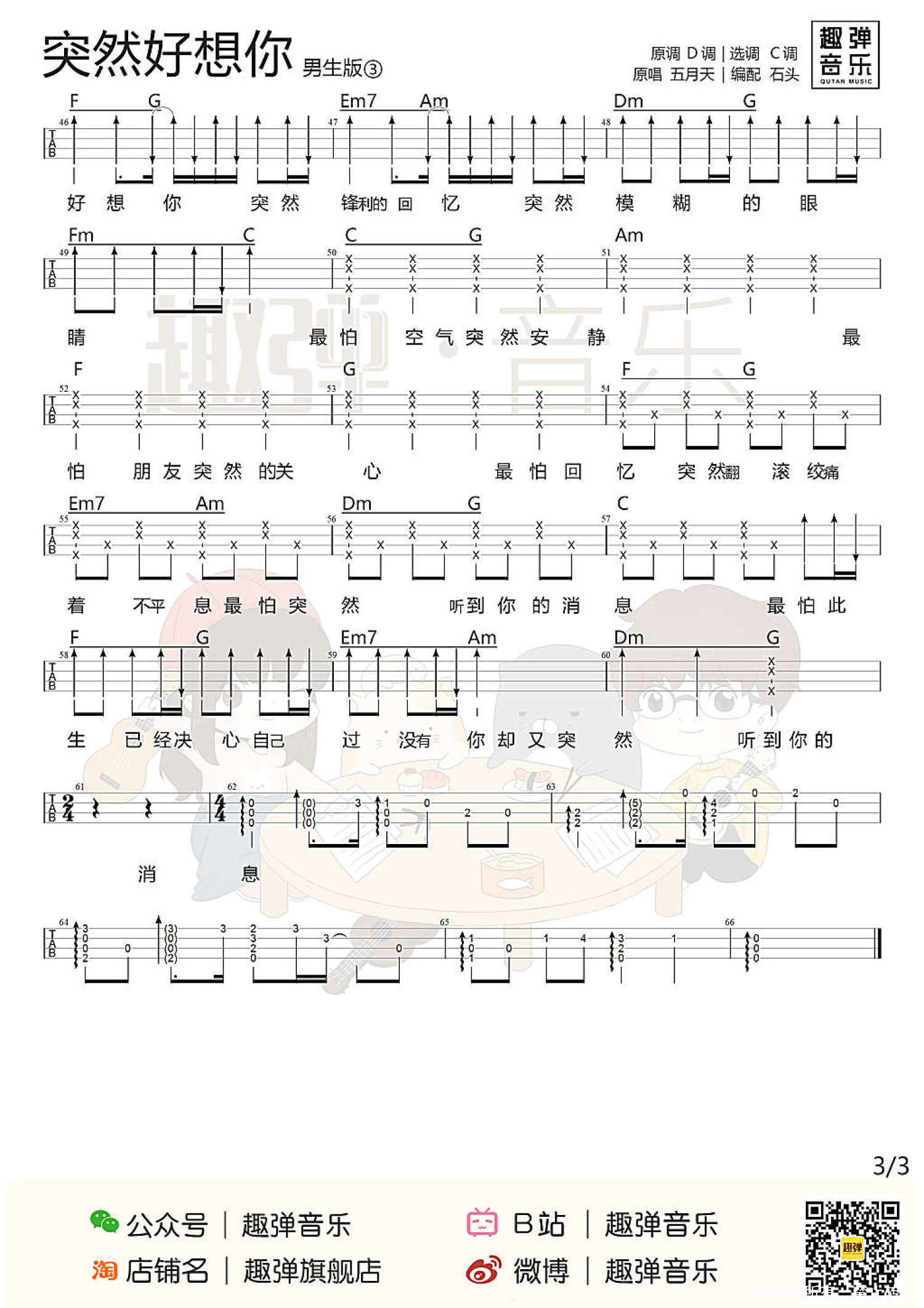 曲谱介绍:  弹唱演示 弹唱教学  弹唱曲谱 目录 陪伴了我整个青春的声音 五月天就是其中之一 他们的歌里充满了能量和生命力 如果你跌倒了想爬起来 那就来听五月天的歌吧 今天石头老师跟大家分享 这首「突然好想你」 讲的是关于初恋的故事 “那么甜 那么美 那么相信” 是对初恋最好的刻画了~    弹唱演示   弹唱教学    弹唱曲谱   男声版   女声版