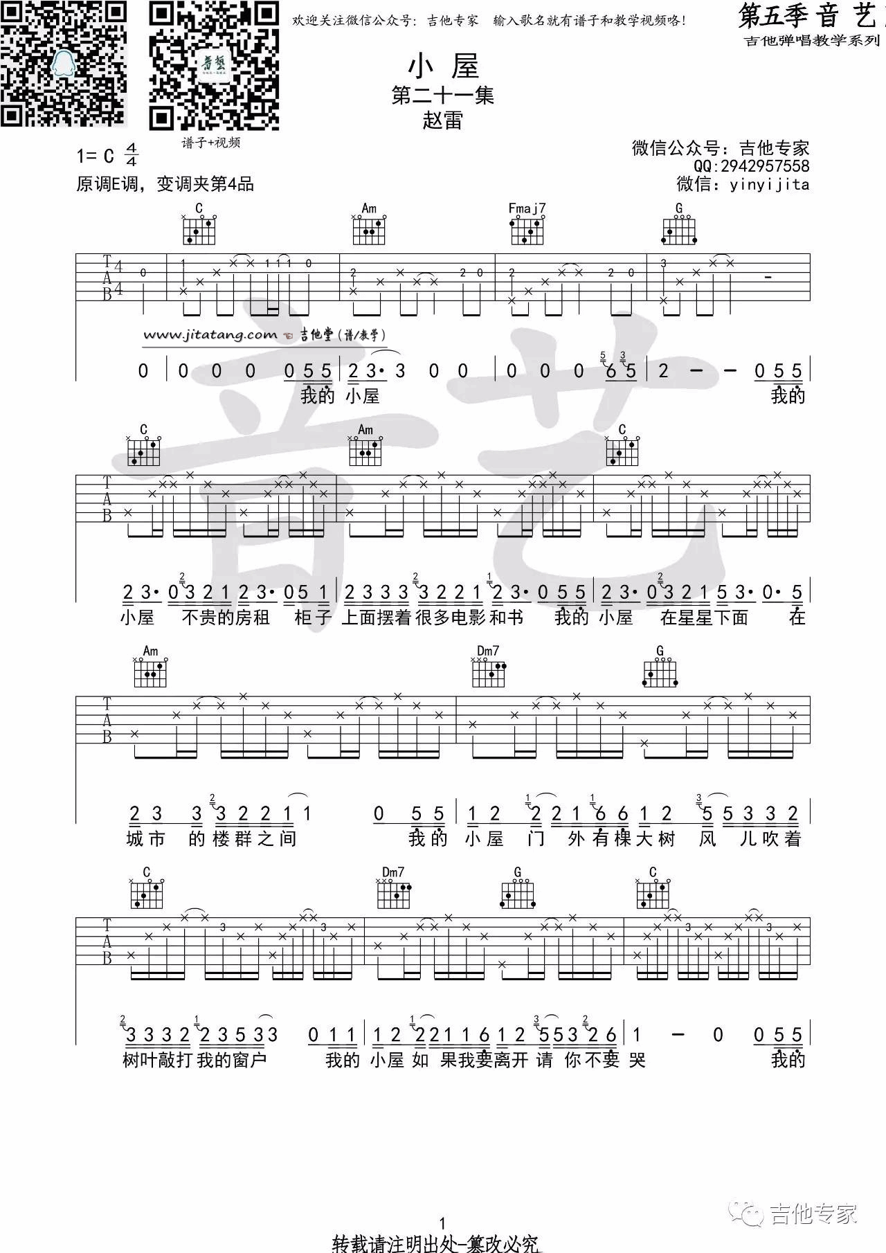 曲谱介绍: 赵雷《小屋》吉他弹唱谱,采用C调指法编配,音艺吉他编配出品,共有4张高清图谱。