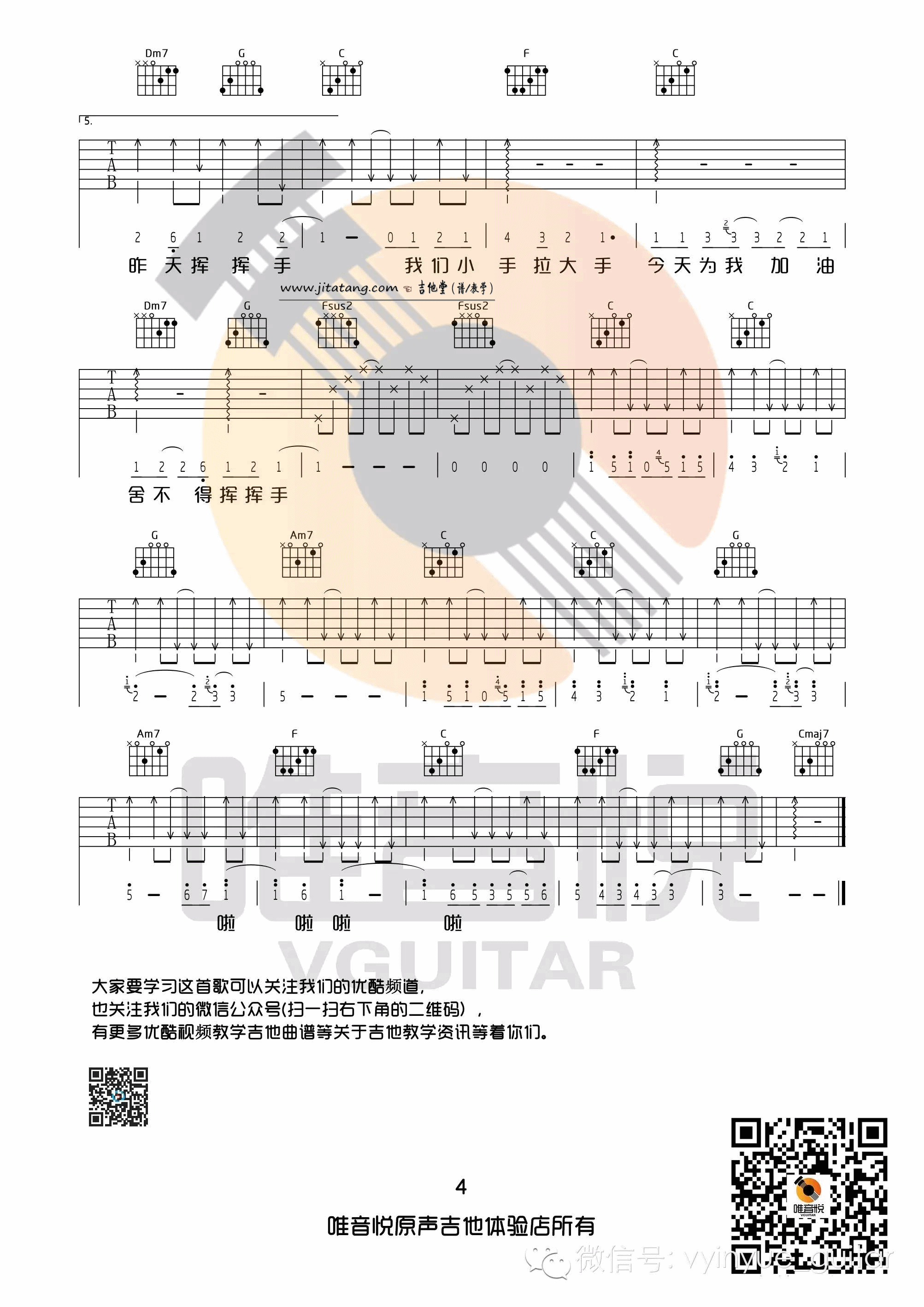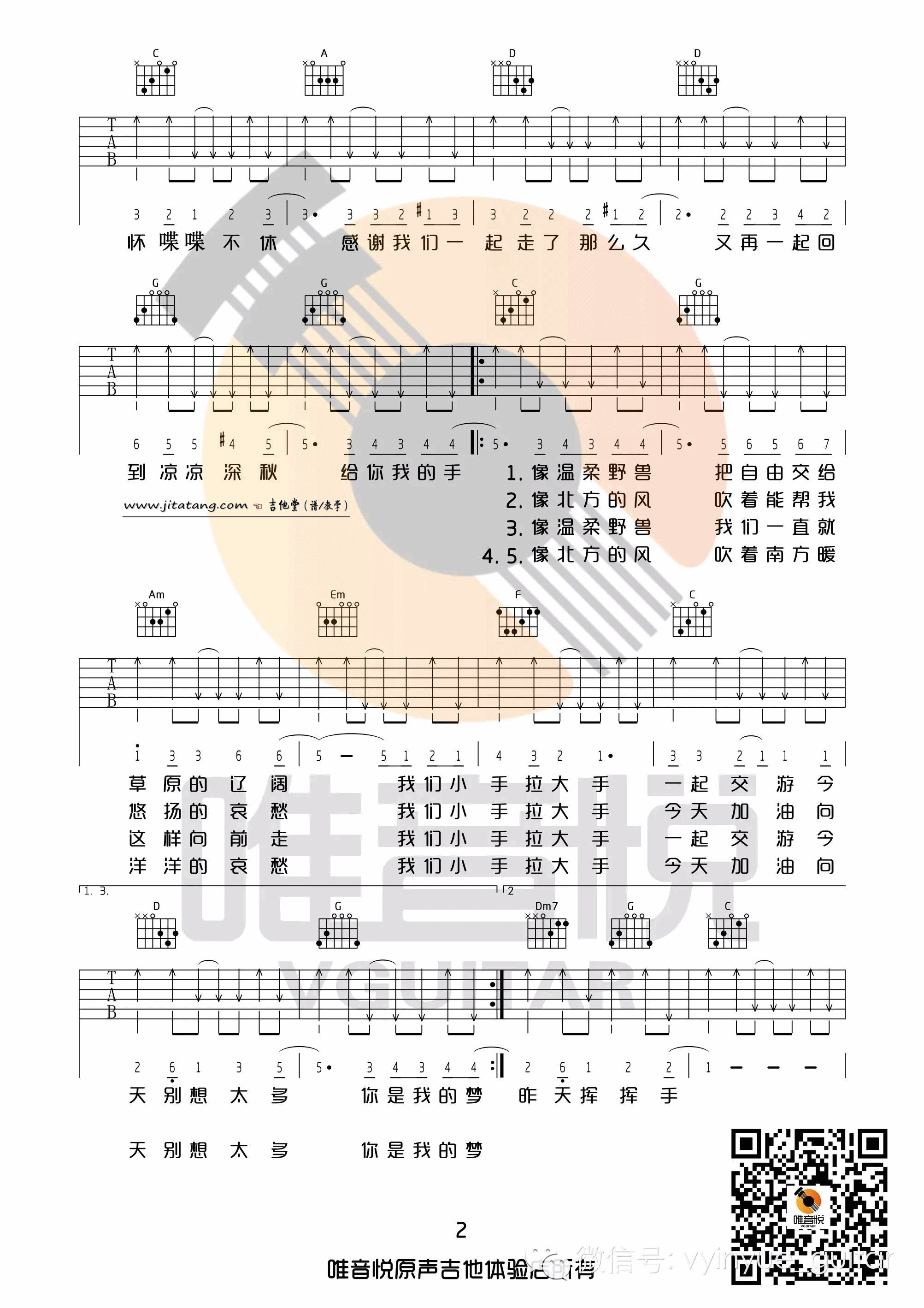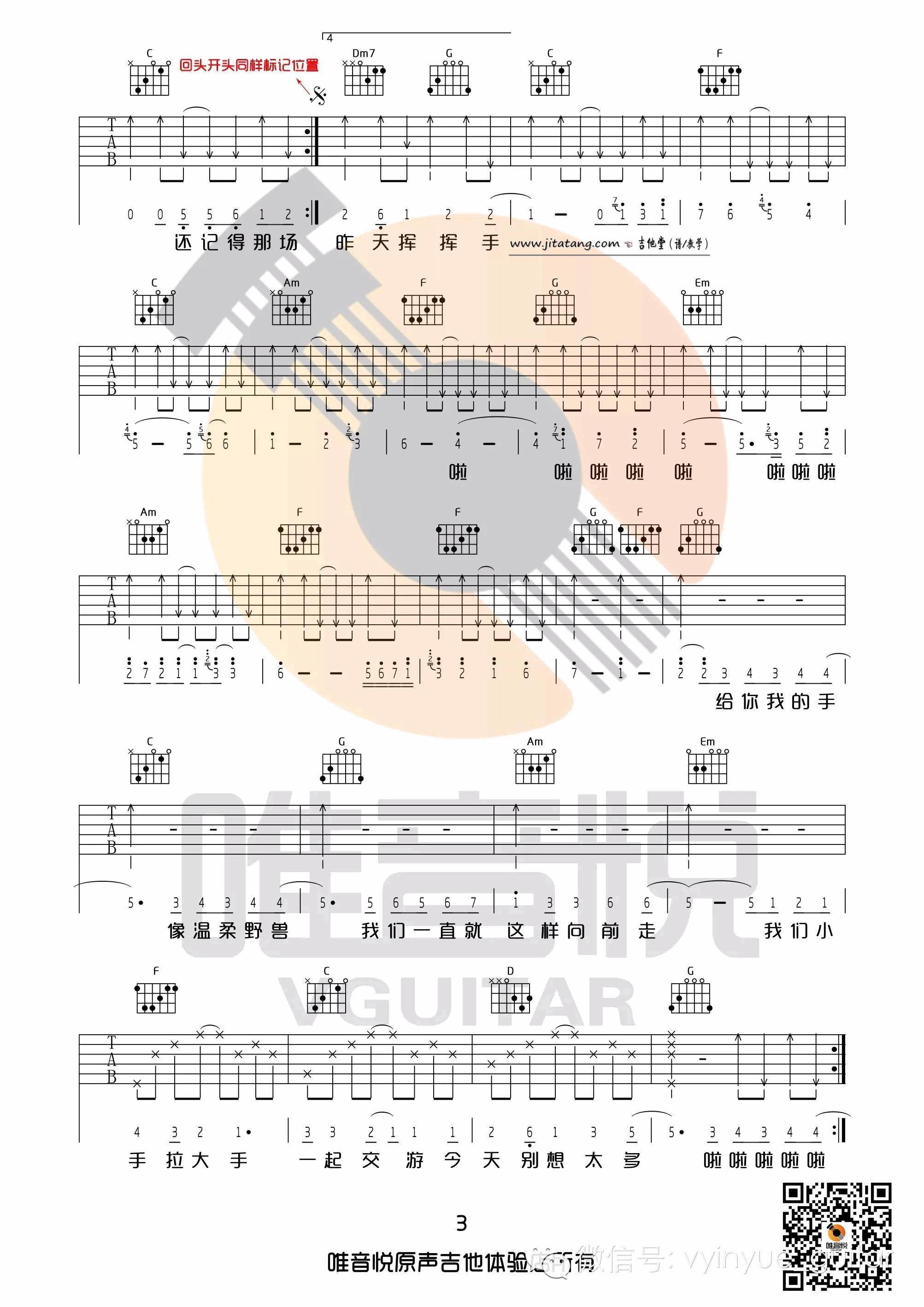 曲谱介绍: 梁静茹《小手拉大手》吉他弹唱谱,采用C调指法编配,唯音悦编配出品,共有4张高清图谱。