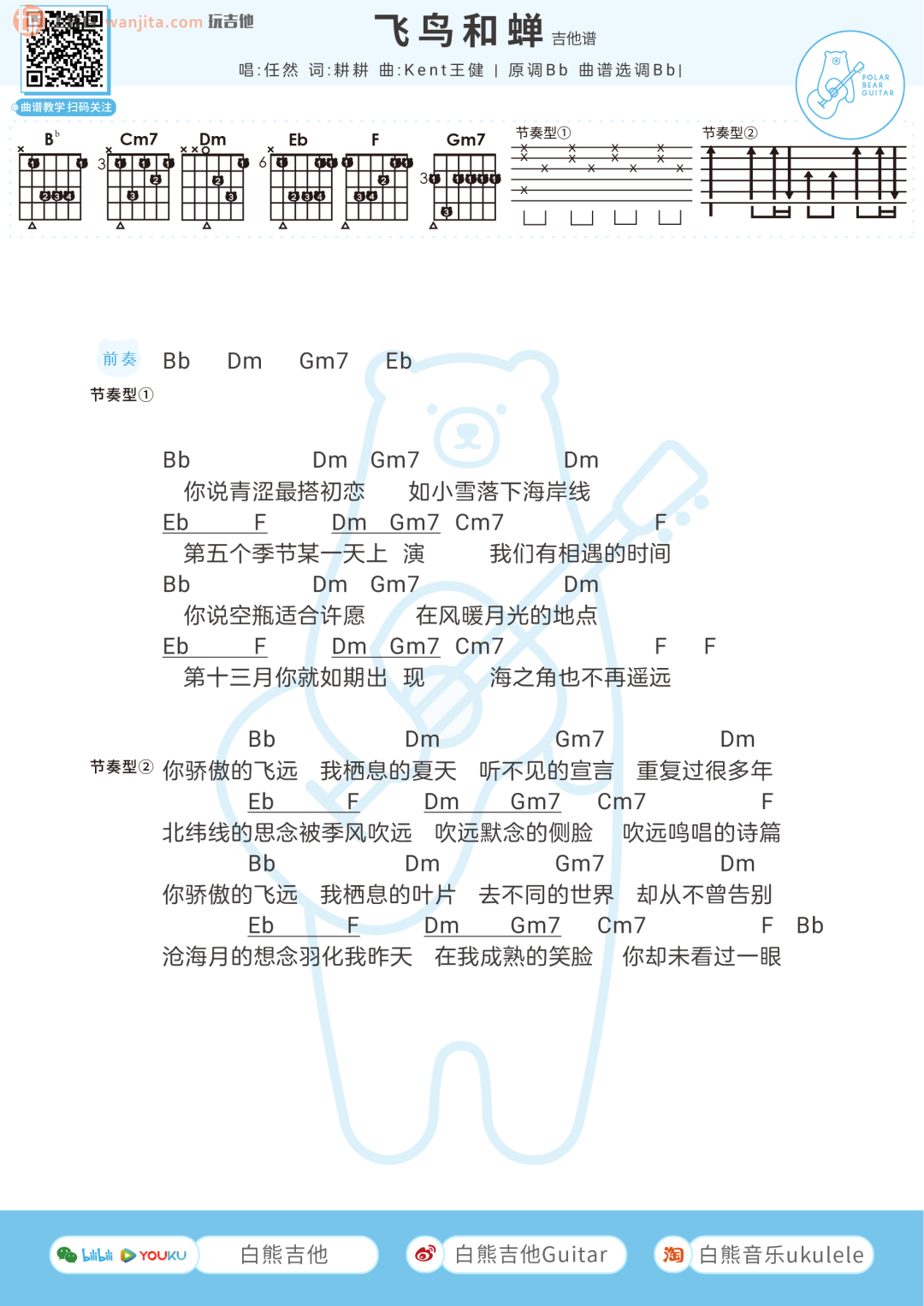 曲谱介绍: 《飞鸟和蝉》吉他谱这个版本的和弦吉他谱由白熊吉他提供,比较简单,总共6个和弦,节奏分为1、2两种。大家可以在主歌用第一种节奏型,副歌用扫弦弹奏,不包含前奏,更适合即兴的简单弹唱。