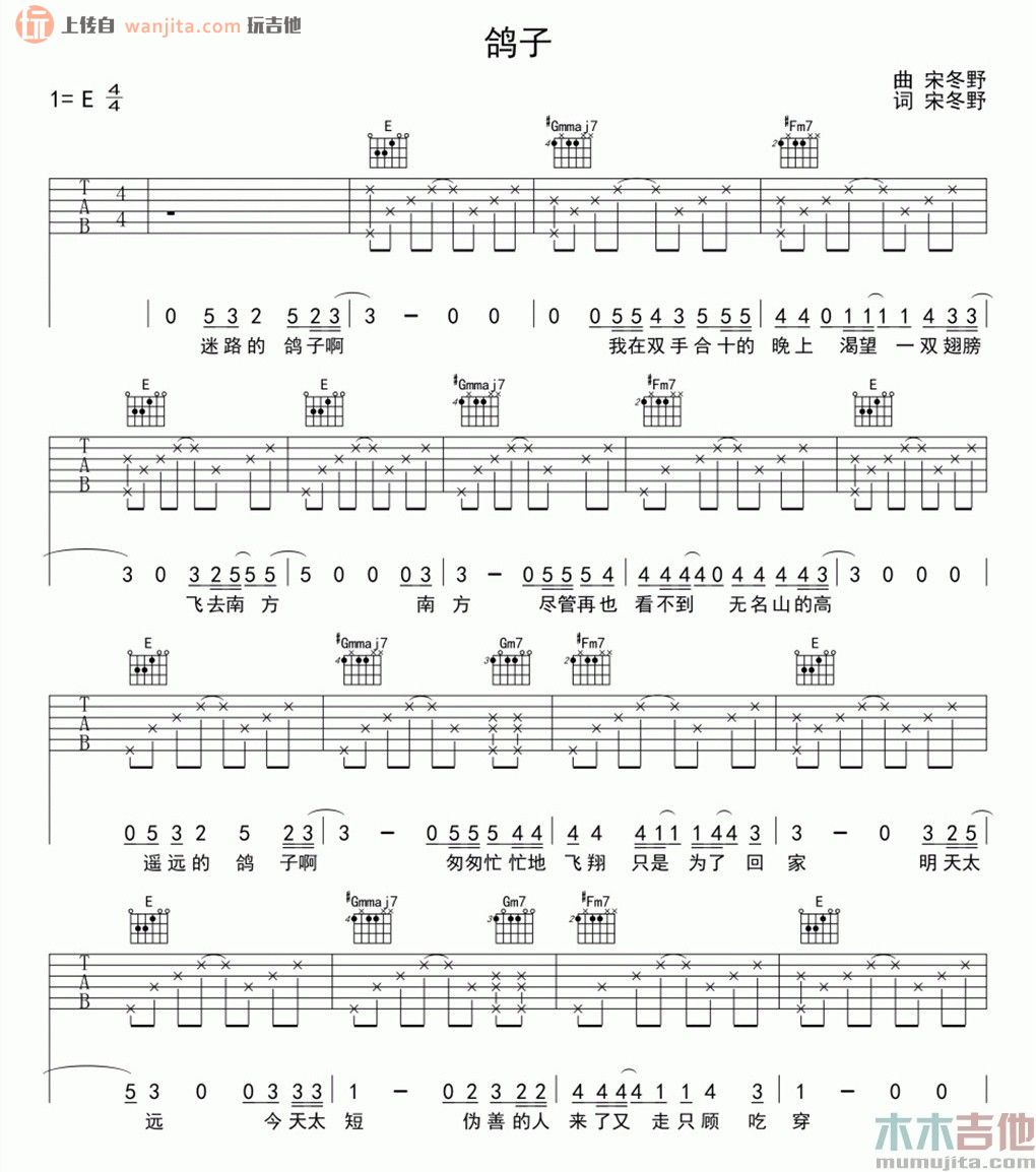 鸽子吉他谱 - 宋冬野 - E调吉他弹唱谱