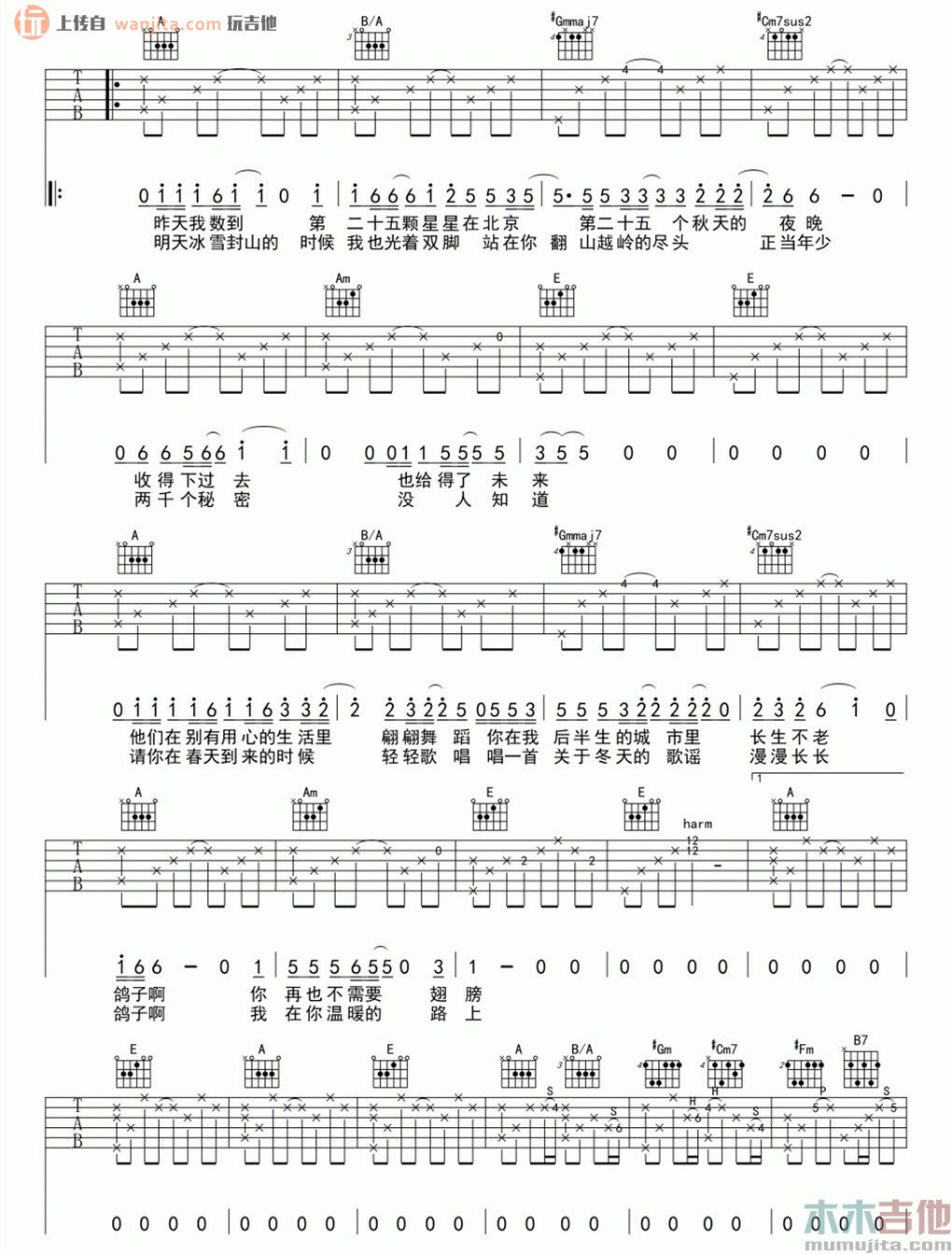 曲谱介绍: 宋冬野《鸽子》吉他谱,总共3张高清图片谱,原调为E调,节拍4/4拍,不使用变调夹,弹唱难度初级。