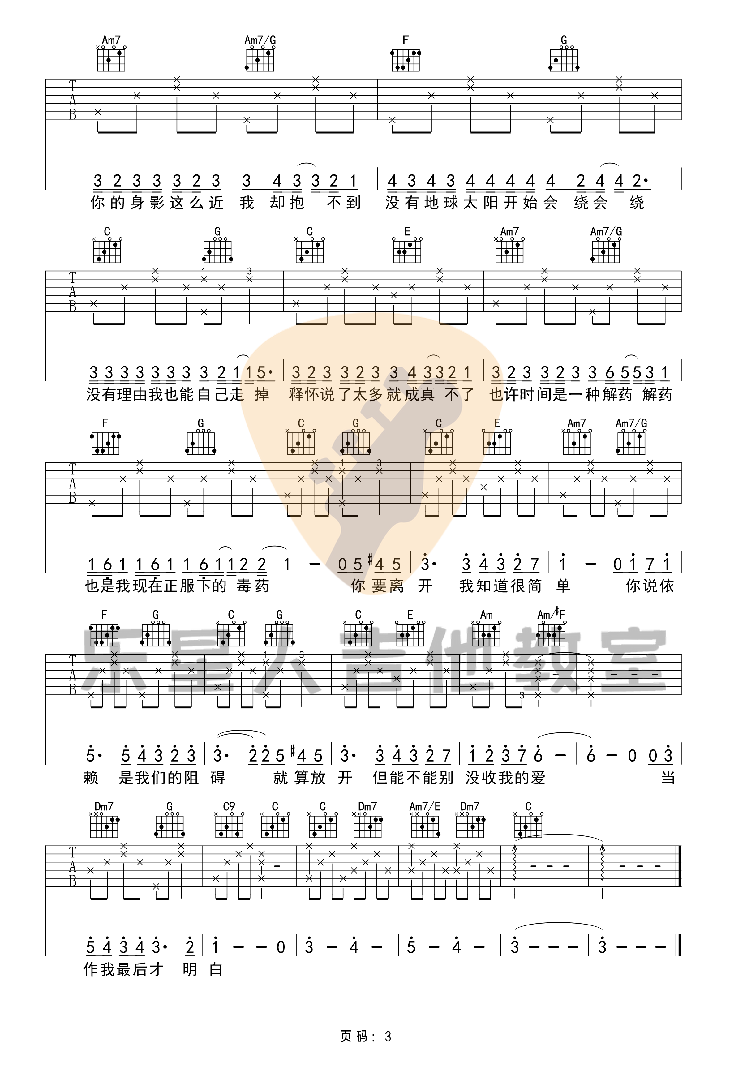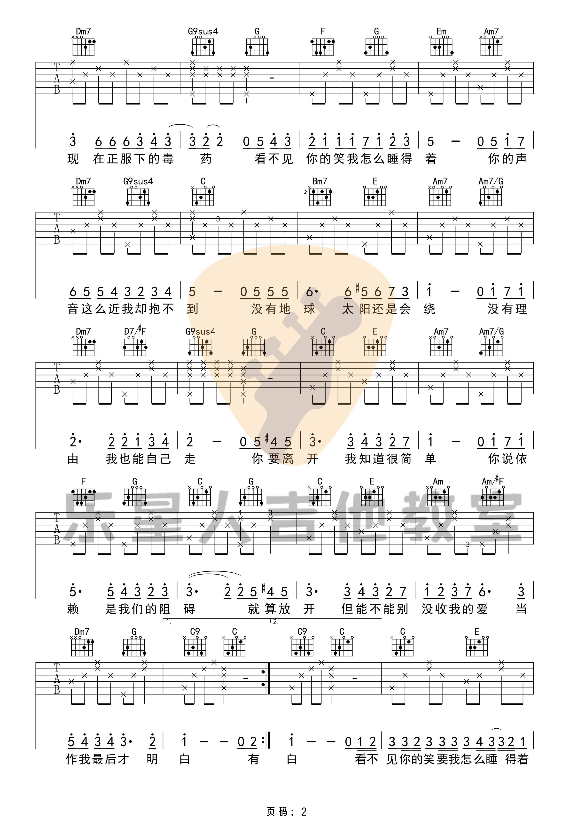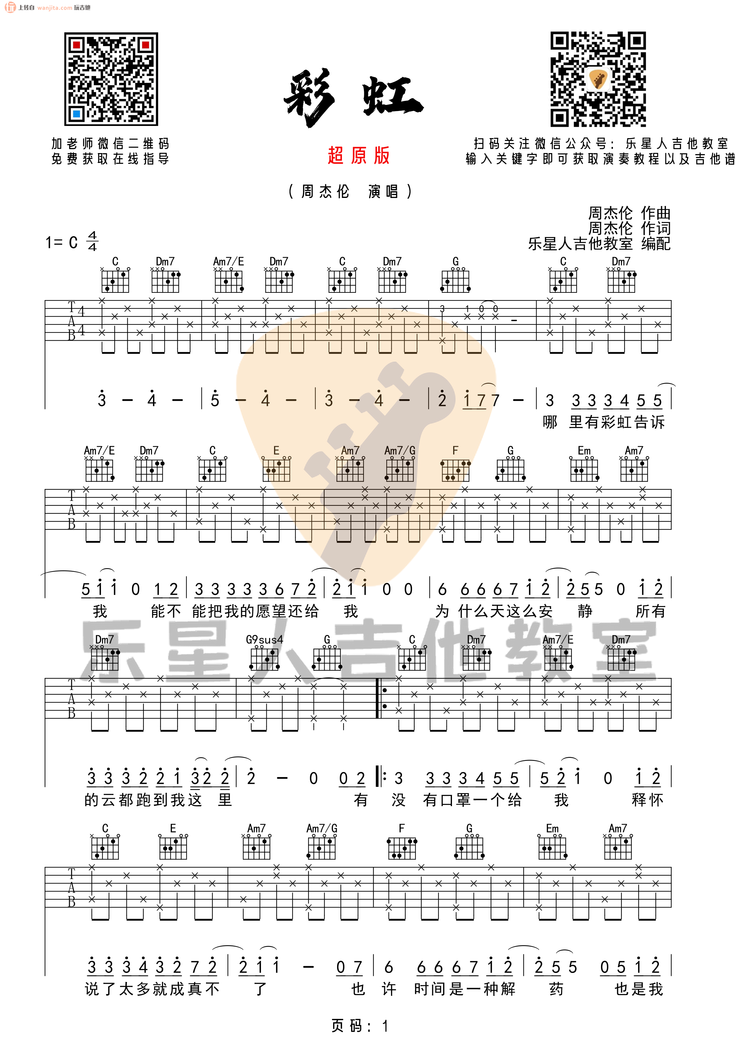 曲谱介绍: 彩虹吉他谱,共3张图片谱,由乐星人制谱,本谱为C调吉他弹唱谱,版本完整按《彩虹》原版编配,节奏部分主要以分解和弦的方式进行弹唱,但也比较适合初学者弹唱练习。