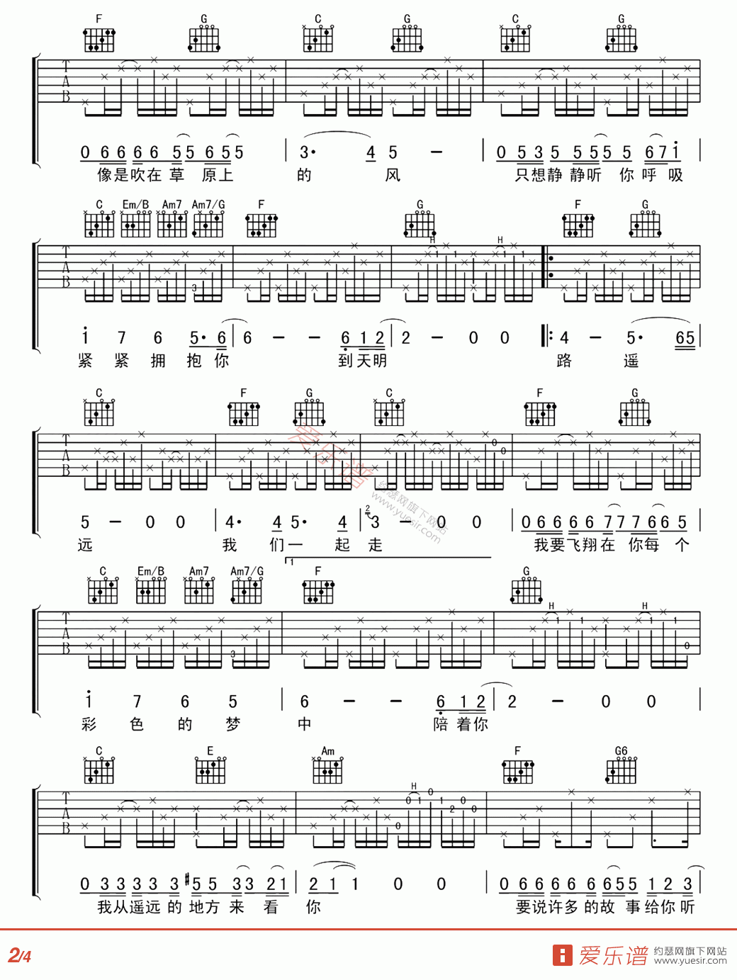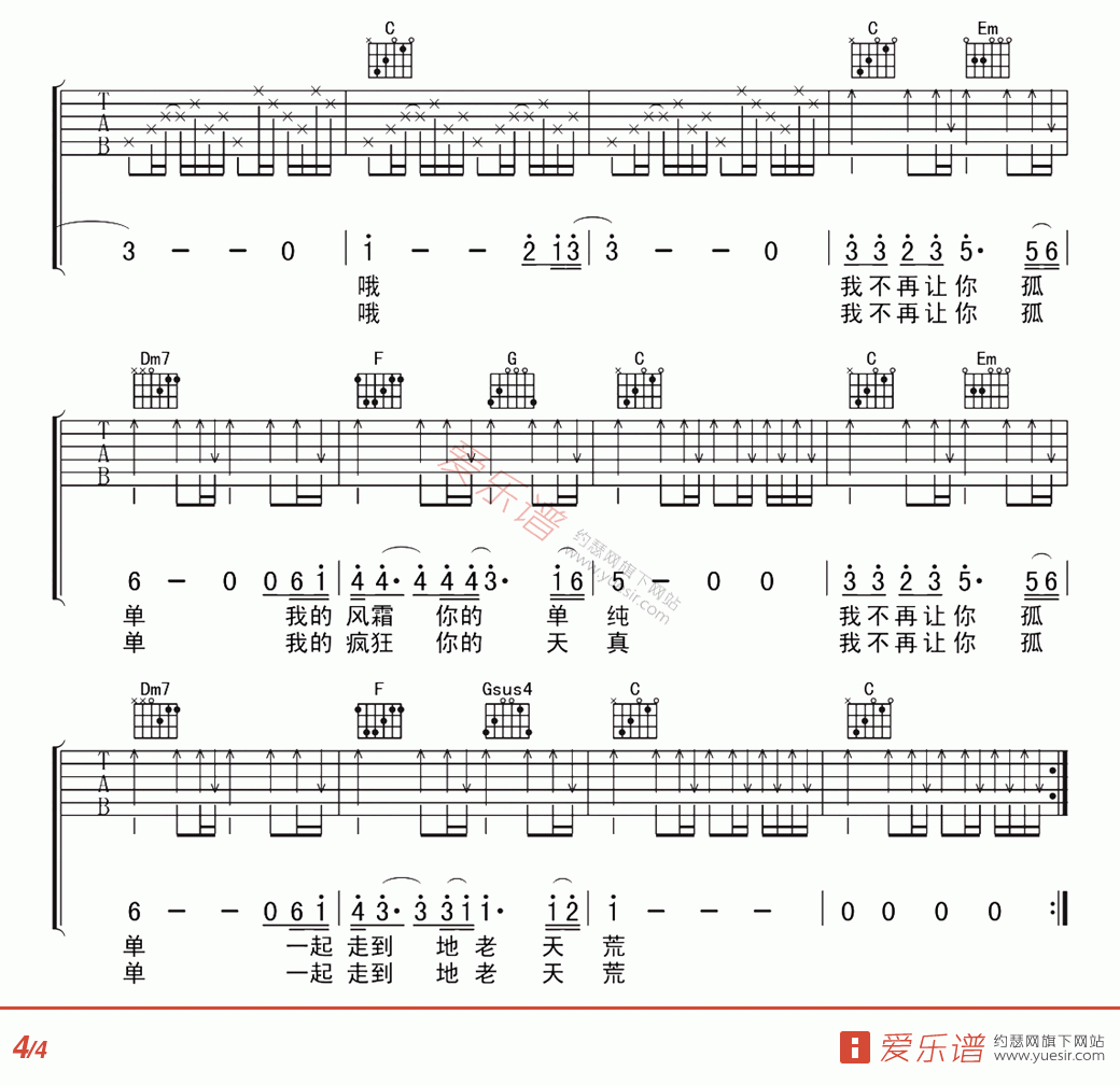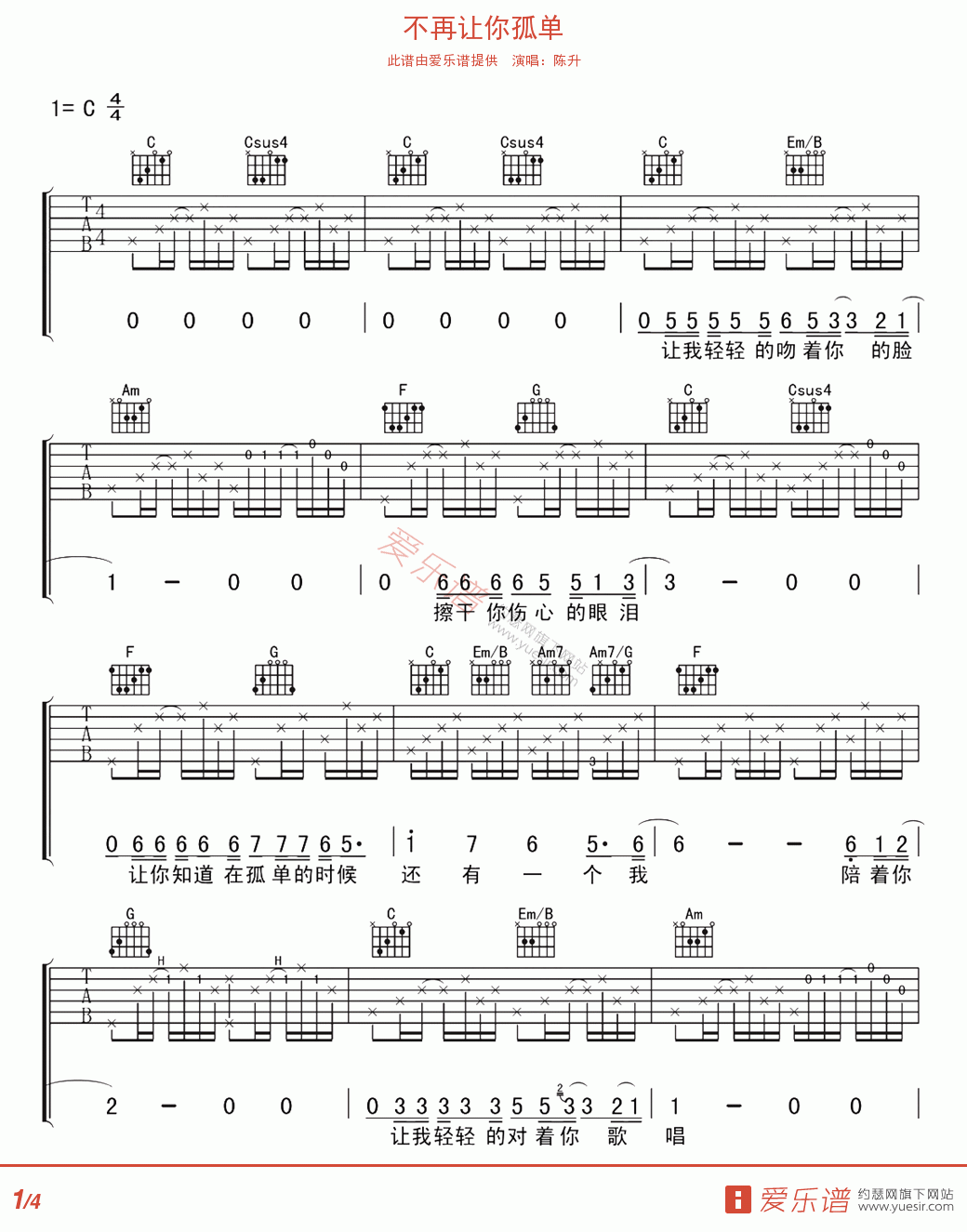 曲谱介绍: 陈升《不再让你孤单》吉他弹唱谱,采用C调指法编配,共有4张高清图谱。