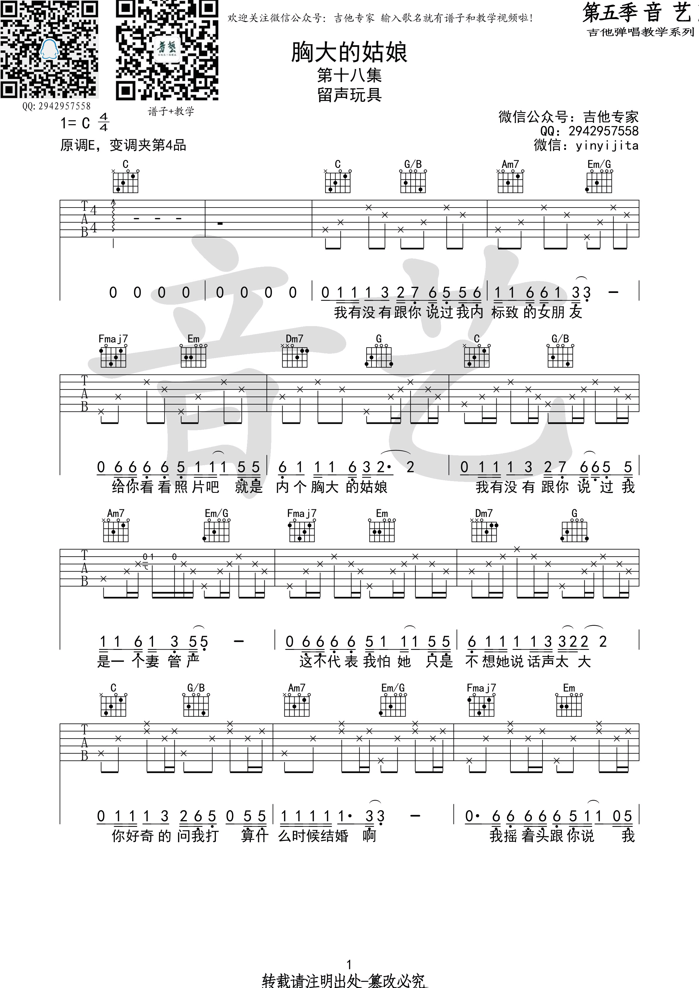 曲谱介绍: 留声玩具《胸大的姑娘》吉他弹唱谱,采用C调指法编配,音艺吉他编配出品,共有3张高清图谱。