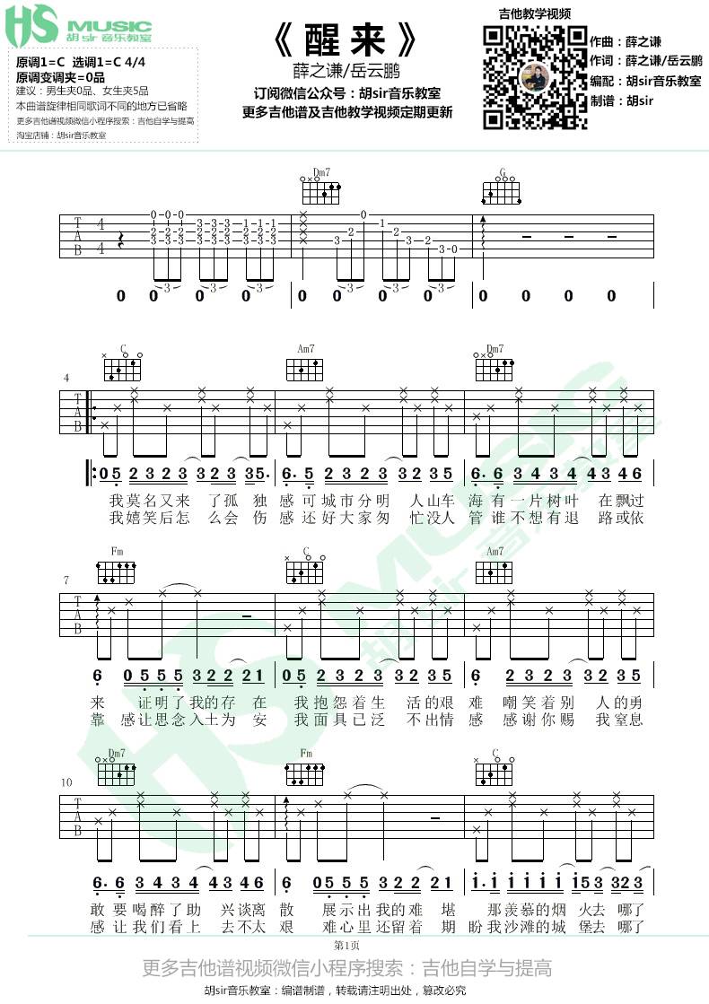 曲谱介绍: 薛之谦《醒来》吉他弹唱谱,采用C调指法编配,胡sir音乐教室编配出品,共有3张高清图谱。