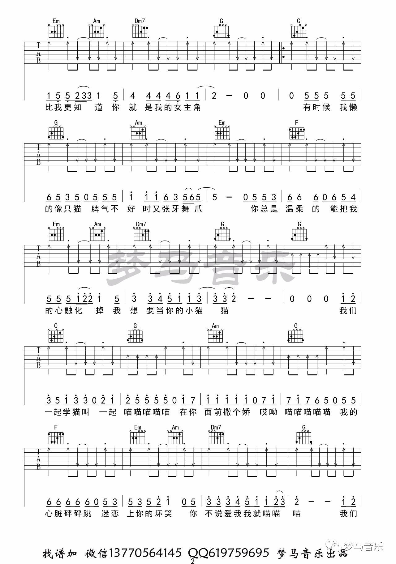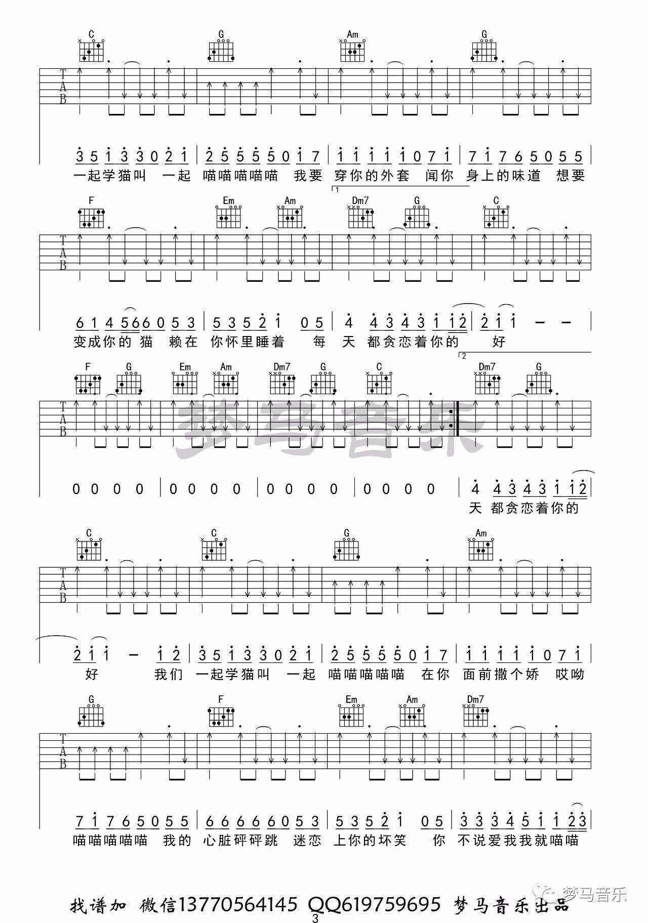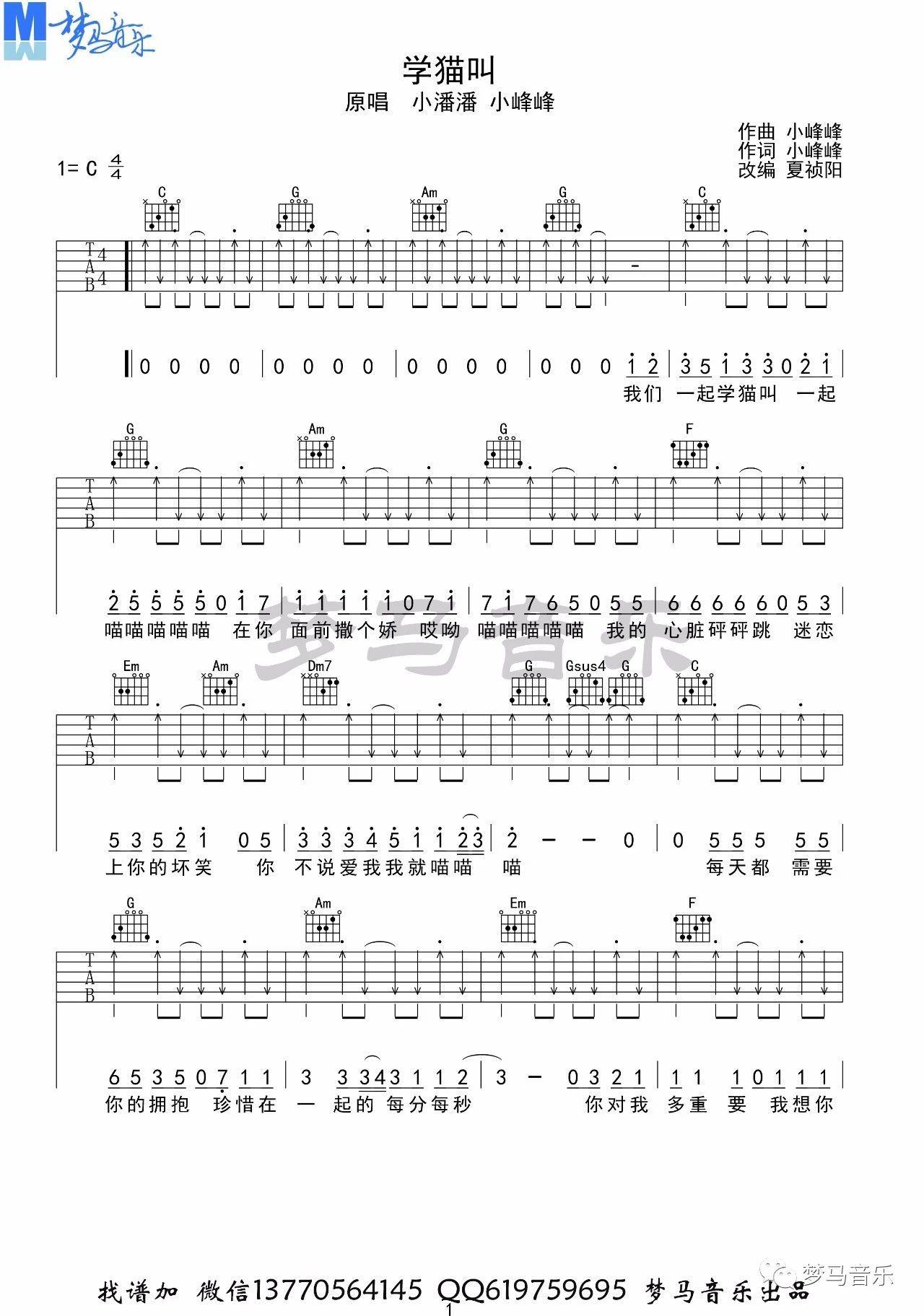 曲谱介绍: 小潘潘《学猫叫》吉他弹唱谱,采用C调指法编配,梦马音乐编配出品,共有4张高清图谱。