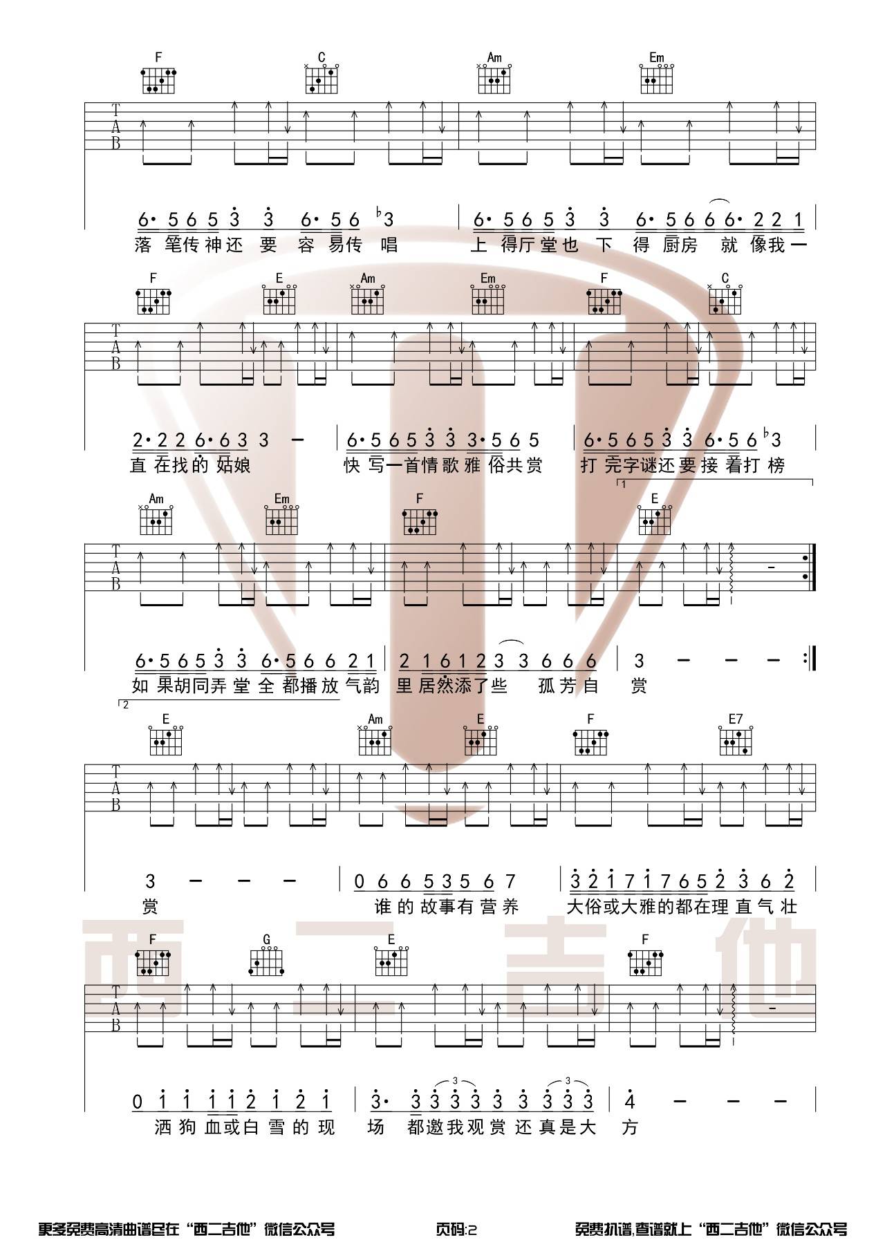 曲谱介绍: 许嵩《雅俗共赏》吉他弹唱谱,采用C调指法编配,西二吉他编配出品,共有3张高清图谱。
