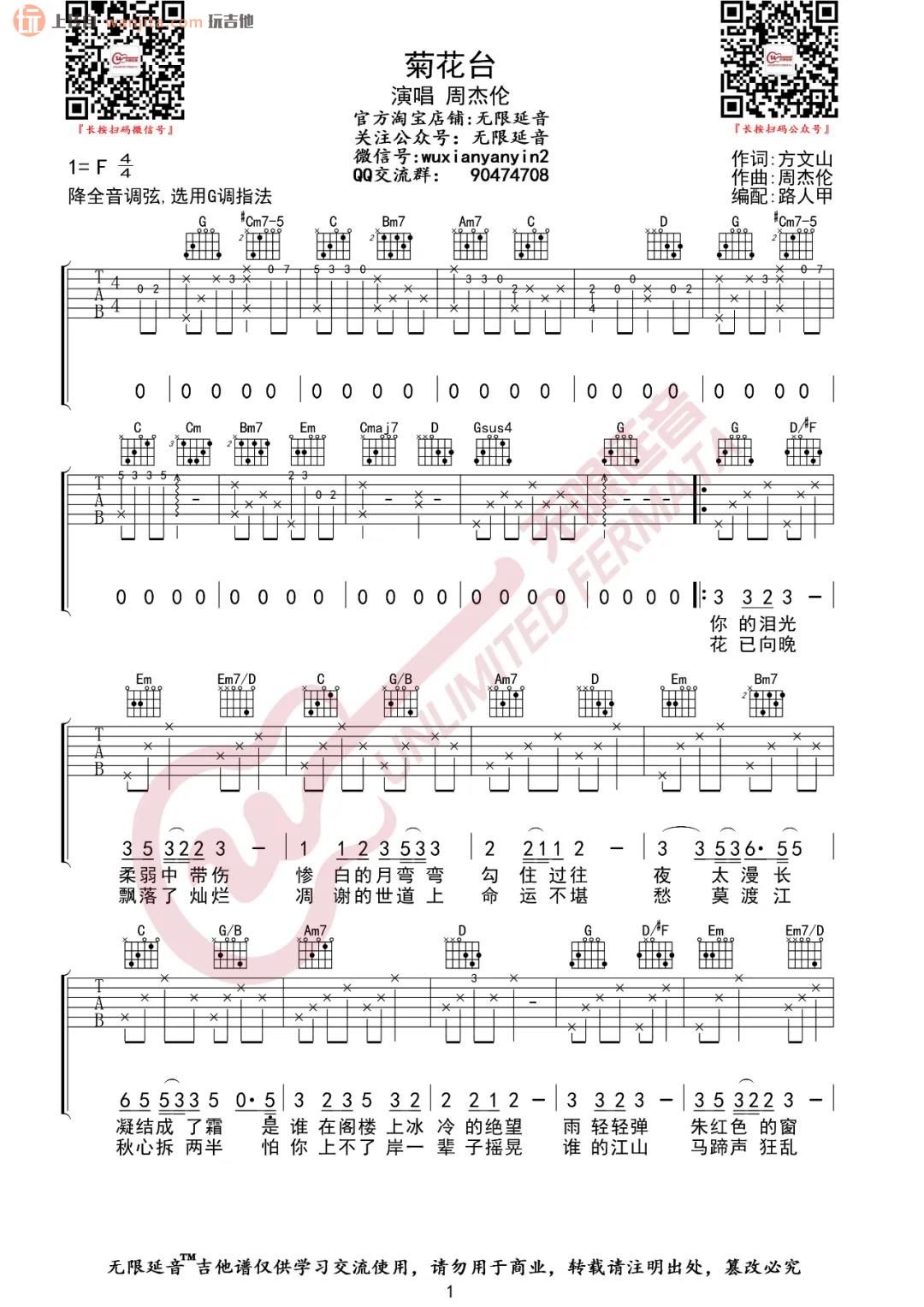 曲谱介绍: 《菊花台》吉他谱,原调是F调,降半音调弦,选用G调指法编配,由无限延音分享提供。谱子比较完整,包含了前奏,同时主歌的分解和弦部分也能很好的弹奏,很多不同水平阶段的朋友都可以试着练习哦。