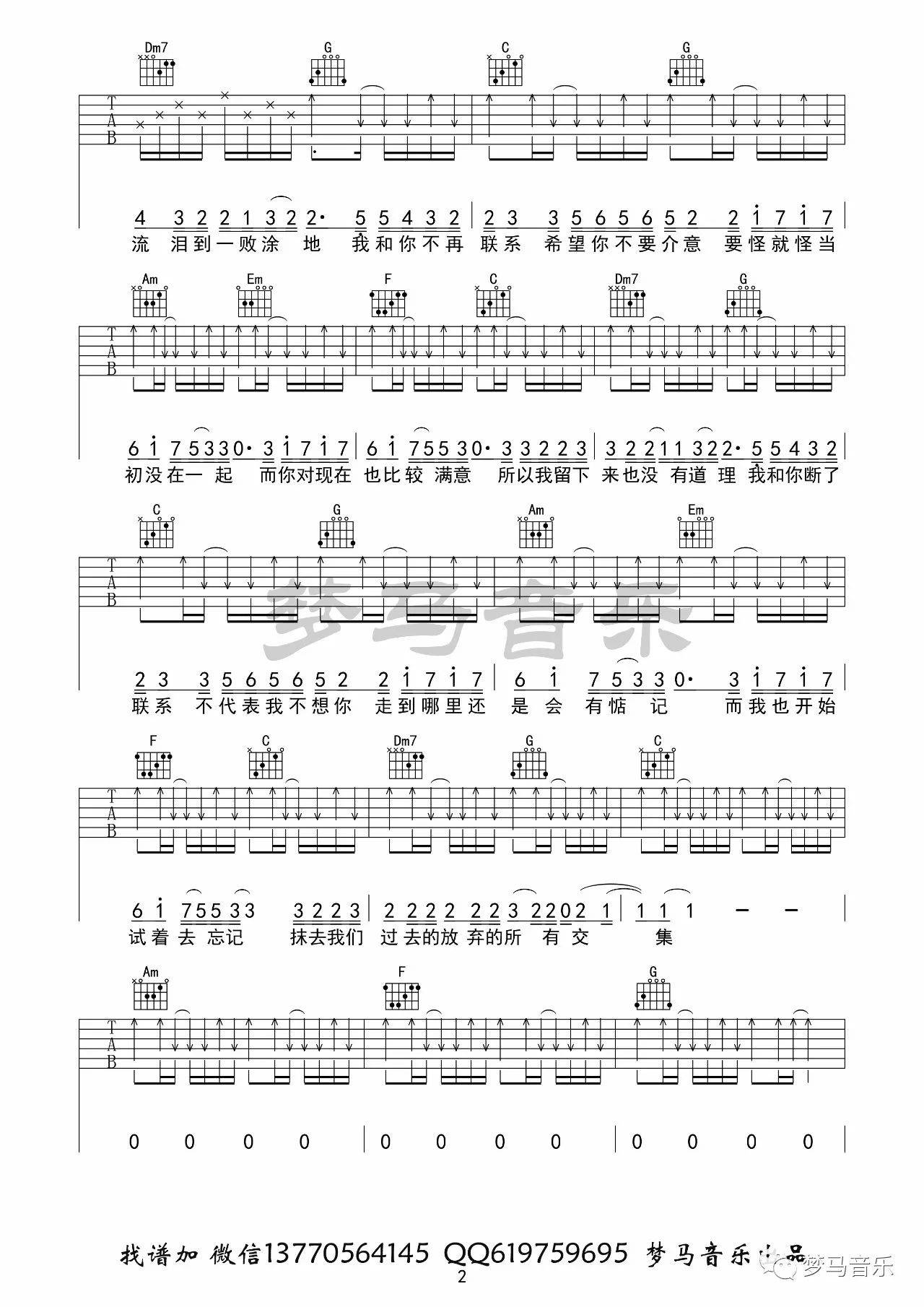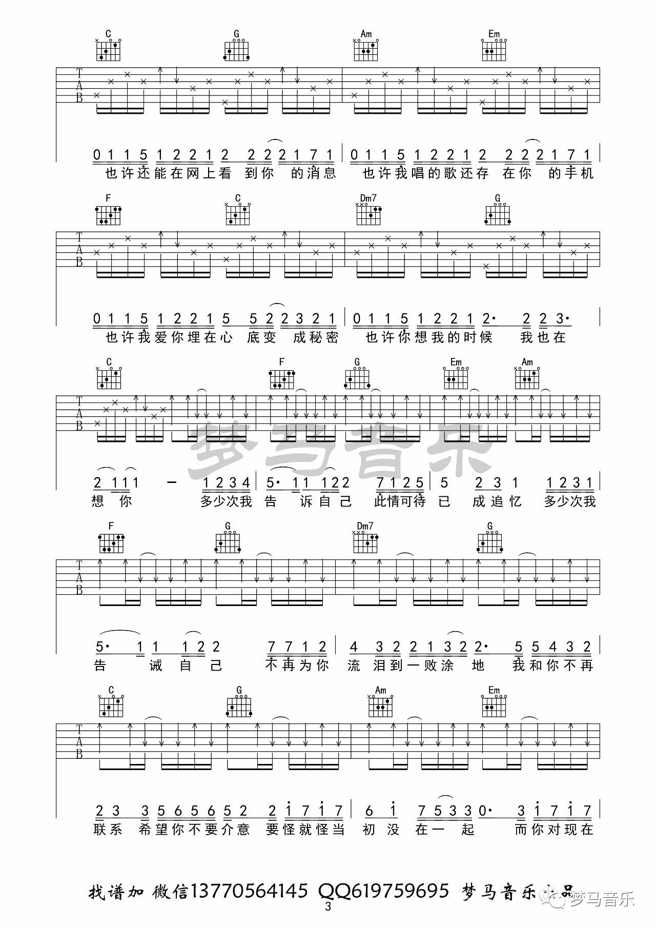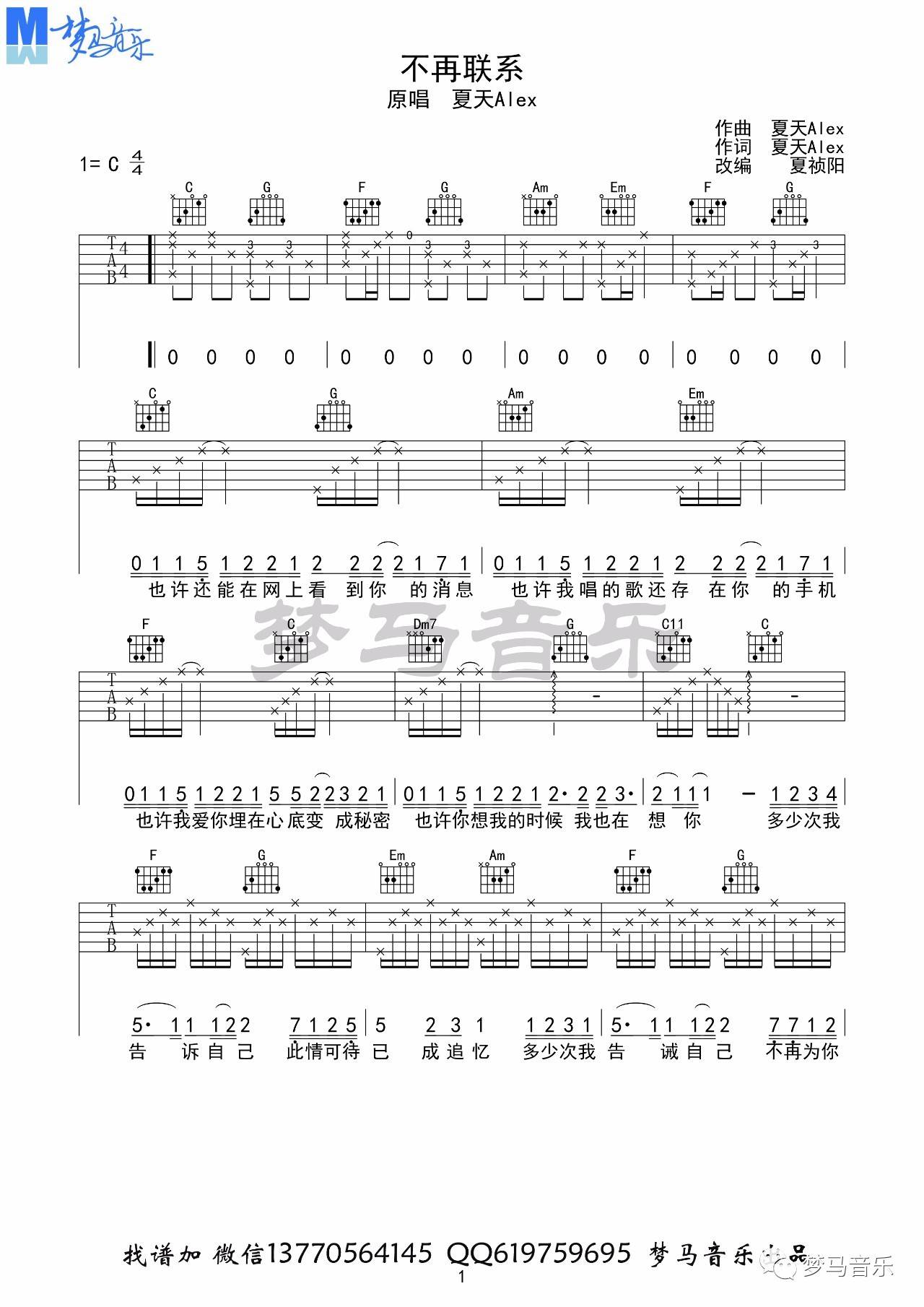 曲谱介绍: 夏天Alex《不再联系》吉他弹唱谱,采用C调指法编配,梦马音乐编配出品,共有5张高清图谱。