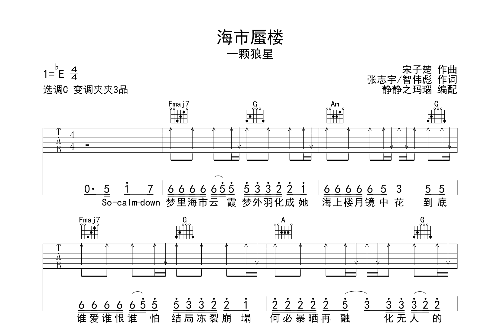 曲谱介绍: 一颗狼星《海市蜃楼》吉他谱本谱采用C调和弦指法编配,节奏为4/4拍,速度为85拍每分钟,弹唱建议变调夹夹3品,也可以根据个人嗓音找到一个舒服的位置,难度初级。
