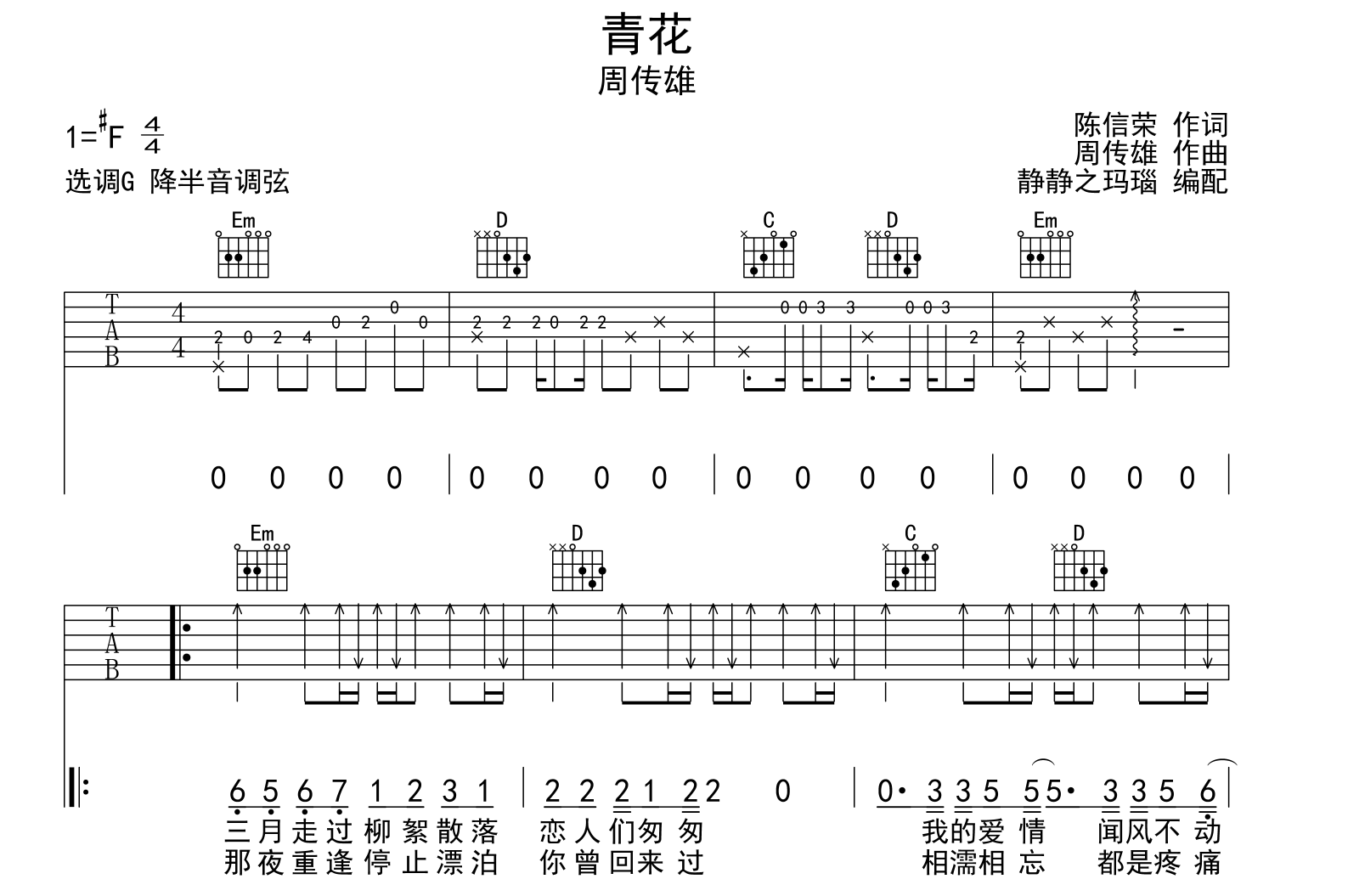 曲谱介绍: 周传雄青花吉他谱,共四张高清六线谱,本谱采用G调和弦指法编配,节奏为4/4拍,速度为80拍每分钟,弹唱建议降半音调弦,也可以根据个人嗓音找到一个舒服的位置,难度初级,《青花》弹唱六线谱由静静之玛瑙创作制谱。