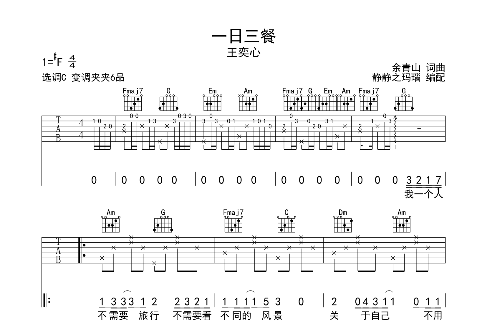 一日三餐吉他谱 - 王奕心 - C调吉他弹唱谱
