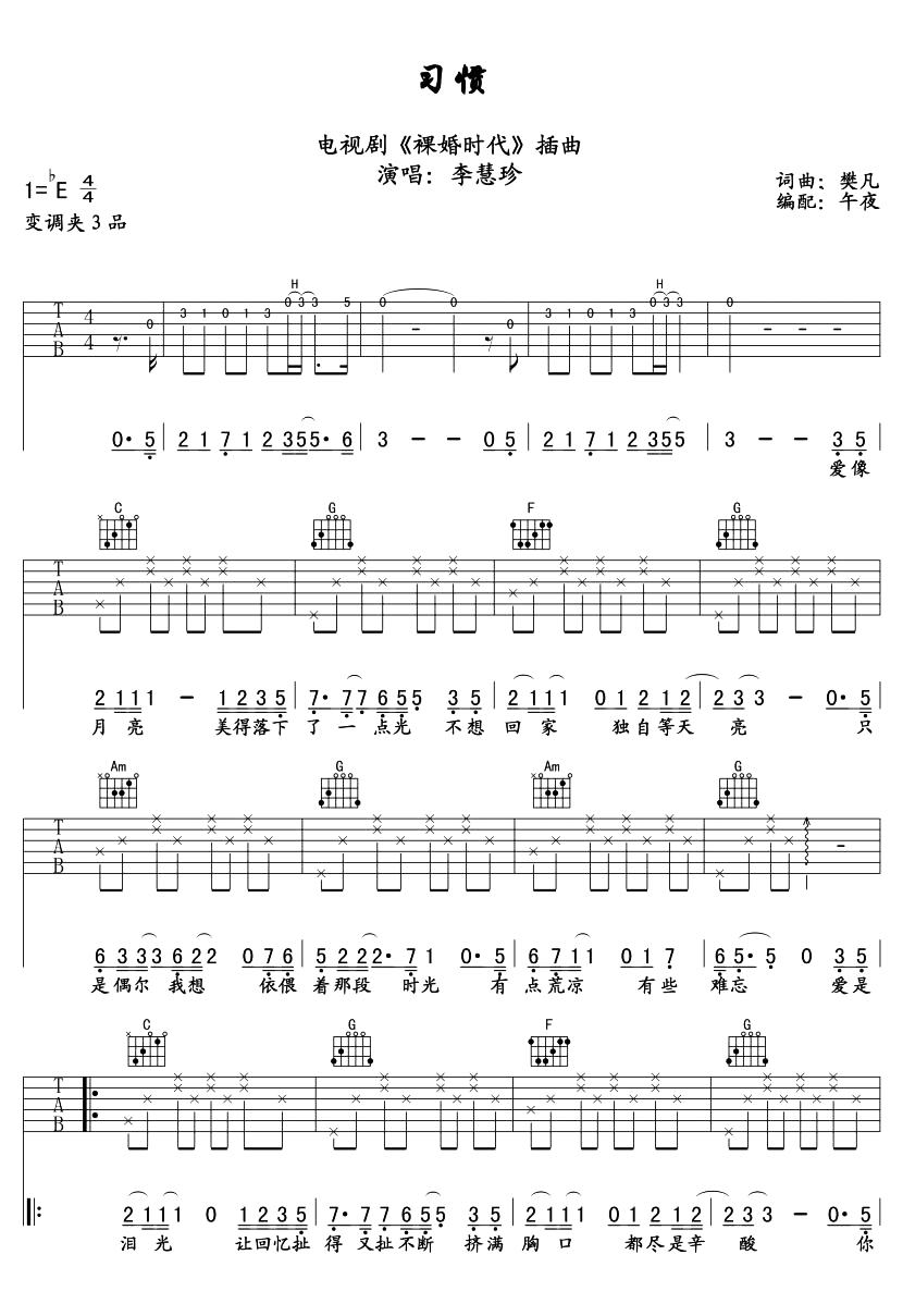曲谱介绍: 《习惯》吉他谱,李慧珍演唱的《裸婚时代》电视剧插曲,由午夜制谱,本谱为C调和弦编配,建议可夹在3品处弹唱,《习惯》吉他弹唱谱,共有2张高清图片谱,难度初级较简单。