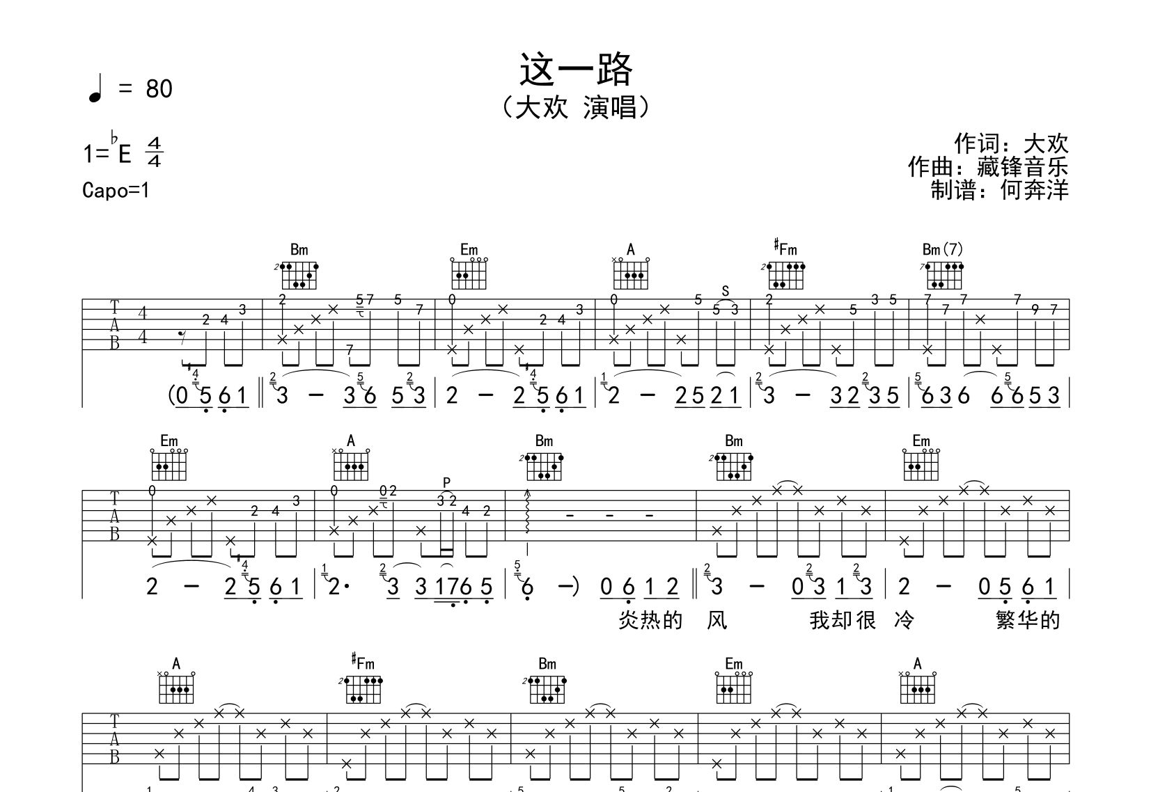 曲谱介绍: 《这一路》吉他谱【附音频】,由何奔洋制谱,D调指法编配,变调夹推荐夹1品弹唱;《这一路》吉他弹唱谱,共两张高清图片谱,速度80BPM,节奏4/4拍,难度较简单。 吉他弹唱预览音频: