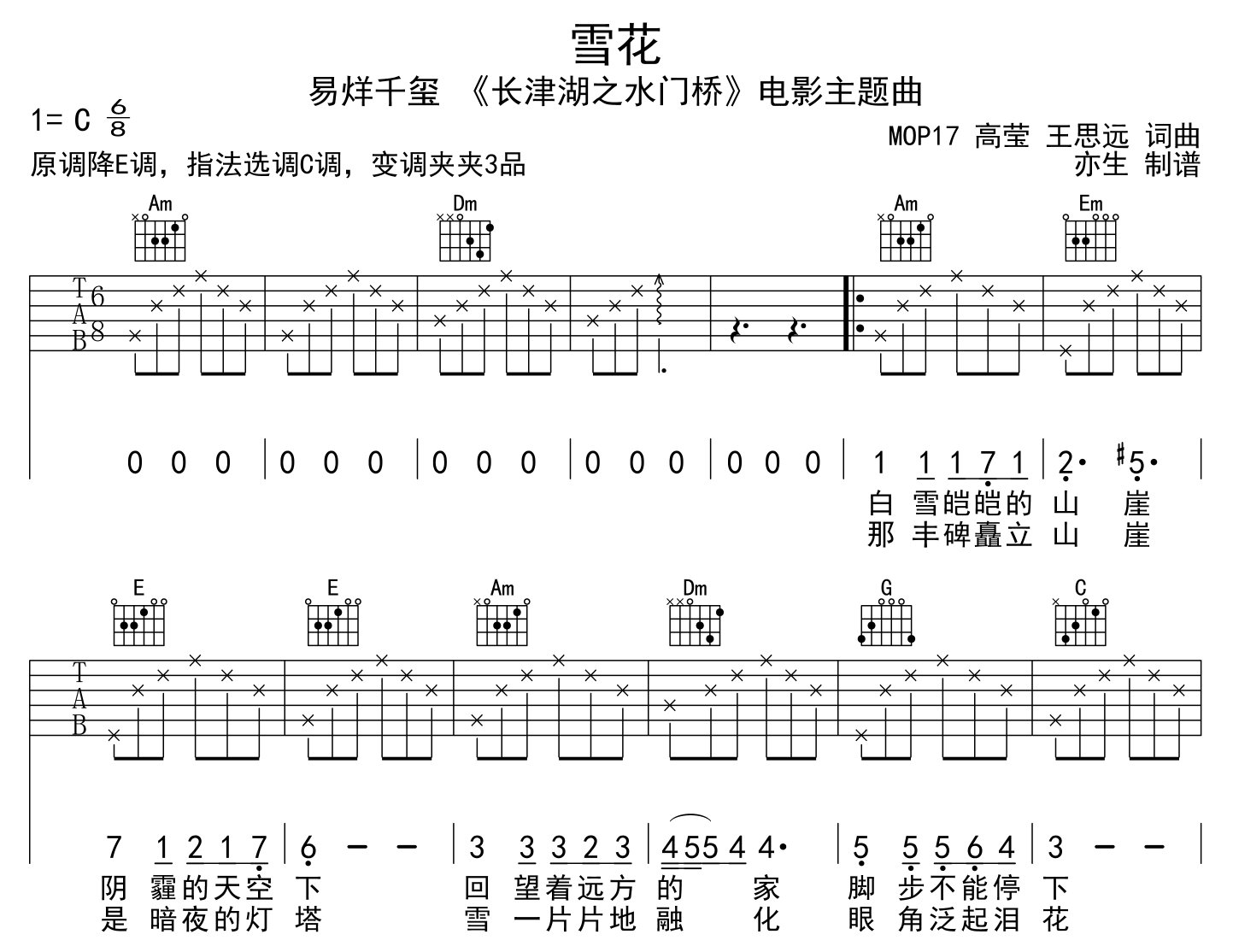曲谱介绍: 易烊千玺《雪花》吉他谱,由创作者亦生制谱,本谱采用C调和弦指法编配,《雪花》吉他六线谱,共两张高清图片谱,节奏为6/8拍,速度为90拍每分钟,弹唱建议变调夹夹3品,难度简单
